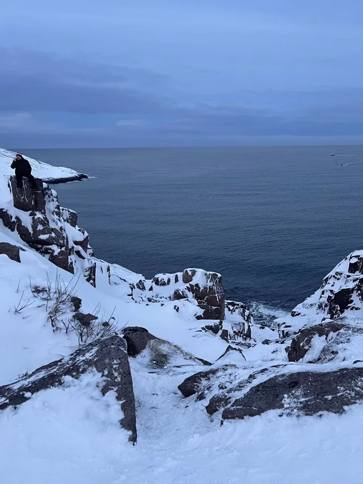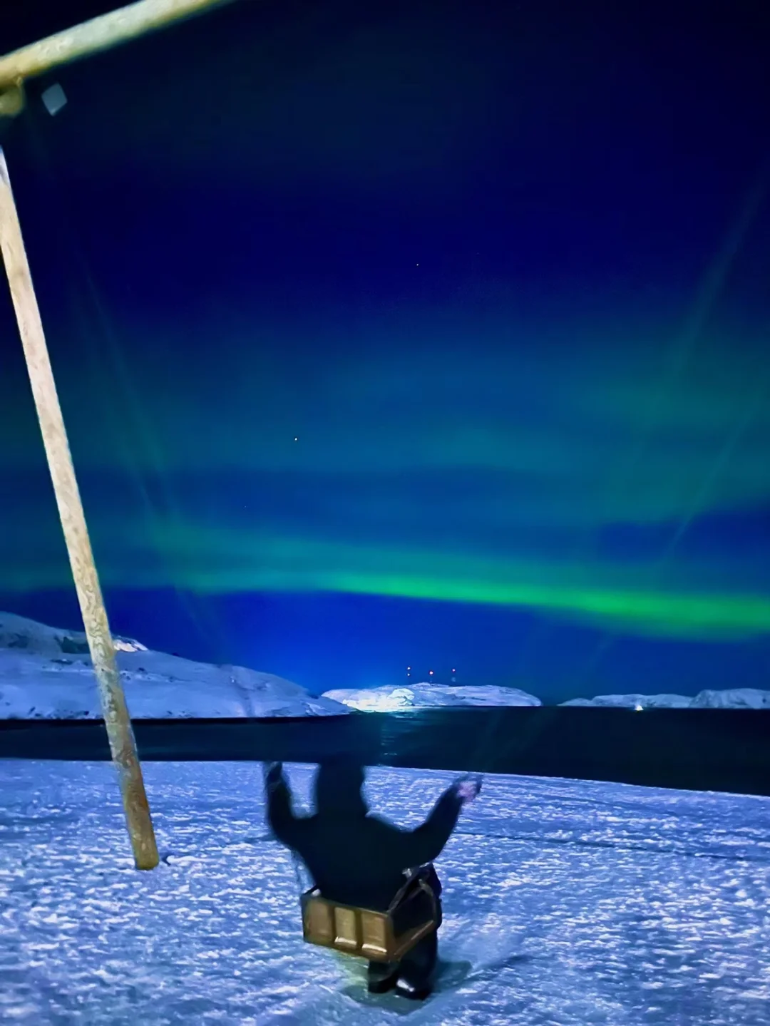 结了冰的北冰洋,冰面泛着淡淡的蓝光,像走进了童话里!晚上二次追光,这次极光比前一晚更亮,绿色的光带还会飘动,太绝了!