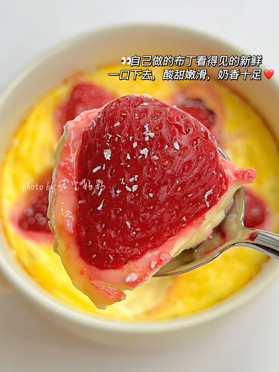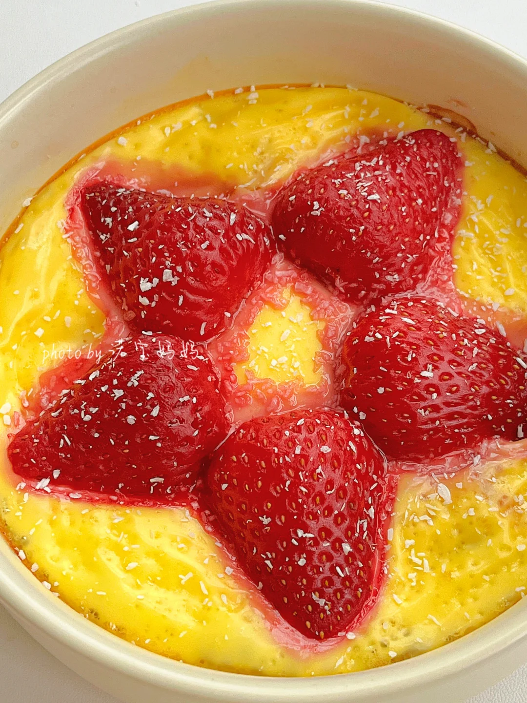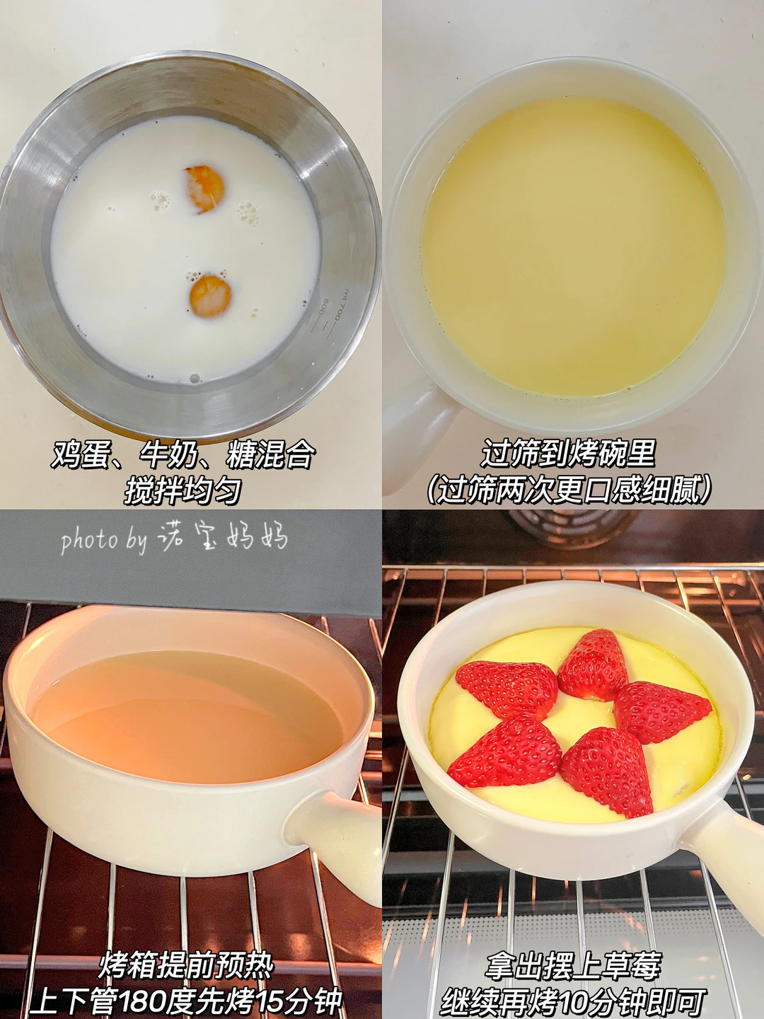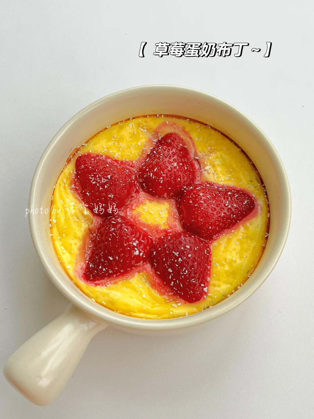 又到了草莓季🍓今天分享一款很适合秋冬的甜品,草莓蛋奶烤布丁~酸甜嫩滑、奶香浓郁、入口即化的口感!墙裂推荐你们试一下!烤过的草莓更甜了,搭配嫩嫩的布丁,一口沦陷~ 🛒食材: 牛奶180克,鸡蛋2个,细砂糖6克,草莓3个 ~~~~~~~~~~~~~~ 👩🍳做法: 1⃣碗中打入鸡蛋,细砂糖,牛奶搅拌均匀 2⃣过筛到烤碗中(两遍更细腻) 3⃣烤箱预热,180度上下火烤15分钟,到时间取出放入草莓,180度继续烤10分钟即可
