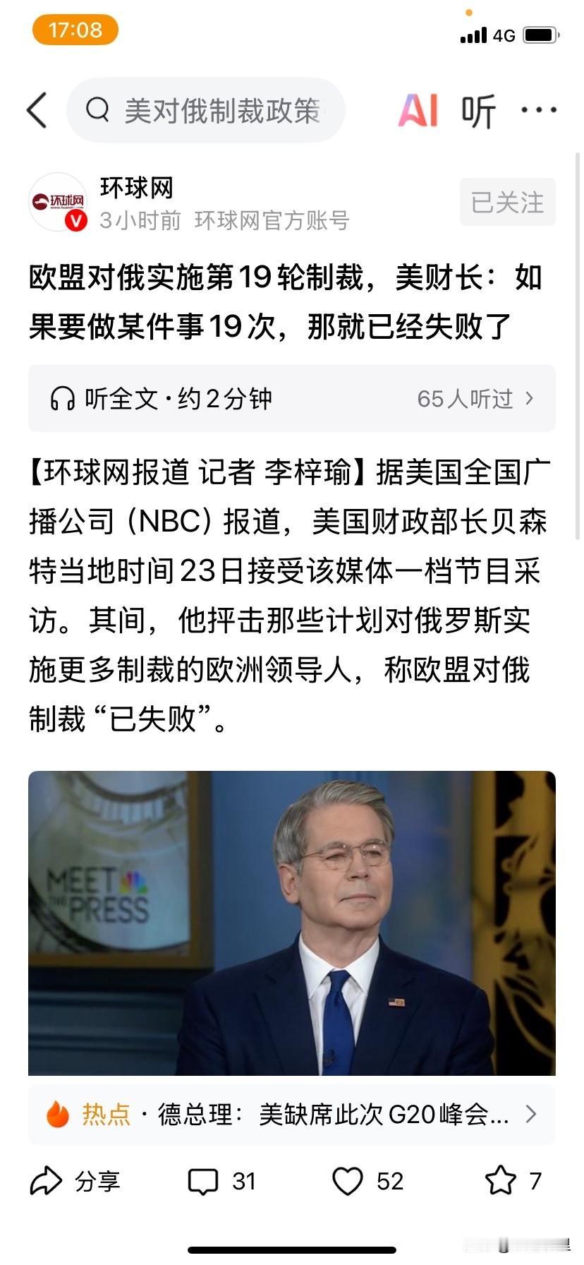 美国财长贝森特现在能说出这话,肯定是被教训过后得到的切身体会,大家看到了吗?连特郎普都学乖了,韩国回去后再也不出尔反尔,再也不拿关税大棒威胁了,为什么?因为自己被打疼了,那么多制裁非但没用,反而打到自己身上,反思一下后知道自己错了,贝森特把体会说给欧盟听了,劝欧盟领导人承认失败吧,欧盟的一群政客也确实弱智,它们应该知道假如制裁有用,面对美国和欧盟的十几轮制裁,俄罗斯早就被欧美肢解瓜分了,哪还能等到欧盟出台第19轮制裁措施,再说能用的制裁手段早就用过了,欧盟这么做,无非是不想承认失败,继续演戏给泽连斯基看而已,而泽连斯基同样演戏给欧美看,只是现在美国不想看戏想退场了,就看欧盟和泽连斯基怎么谢幕吧