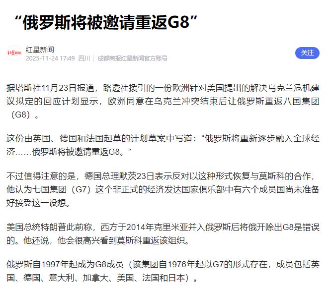 俄乌形势发生转变!欧洲为拉拢俄罗斯,开出诱人条件! 11 月 23 日有媒体消息称,路透社援引了一份欧洲方面的计划草案,这份文件是为回应美国提出的乌克兰危机解决方案而拟定的,其中明确提及,待乌克兰冲突画上句号后,欧洲将同意俄罗斯重新回归八国集团(G8)。 现在国际上炒得热闹的“邀请俄罗斯重返G8”,看着是个外交提议,其实根本不是简单的“要不要让俄回来”,核心是全球治理的老框架遇上了新现实,各方都在打着自己的算盘。 先说说这个提议本身,不是之前传的只有英德法三国琢磨,新曝光的文件里写着,是法国、意大利、西班牙这些六个欧洲国家一起推动的。 他们的理由挺实在,说长期孤立俄罗斯,不仅欧洲能源安全没保障,连全球气候治理、核不扩散这些大事都没法推进。 这话说得有道理,毕竟G8当年可不是光聊经济的俱乐部,早在上世纪就搞过全球伙伴计划,专门处理化学武器销毁、核潜艇拆解这些安全议题,现在这些问题没俄罗斯参与,根本推不动。 但这背后也藏着欧洲的小九九,他们心里清楚,没有俄罗斯,很多国际规则就是空谈,与其硬扛着对立,不如抛出橄榄枝探探路。 可西方内部根本没达成一致,分歧比想象中还大。德国总理默茨直接说,只要俄罗斯没撤军、没担战争责任,就绝不能让它回来,还强调G8是“共享民主价值观的俱乐部”。 法国总统马克龙也跟着表态,说现在完全没有让俄重返的条件。这俩人的话其实点破了关键。 西方想拉俄回来,又不想放下“价值观优越感”,既想让俄帮忙解决实际问题,又不愿在核心诉求上让步,这种矛盾的心态,让提议从一开始就很难落地。 更有意思的是,G7刚开完会还说要加码对俄制裁,转头就讨论邀俄重返,这种前后矛盾的操作,说白了就是没拿定主意,既怕得罪美国,又怕自己经济扛不住。 再看俄罗斯这边,人家根本不接这茬。克里姆林宫发言人佩斯科夫说得明明白白,俄罗斯从没求着要重返G8,要对话就得基于平等和现实。 这话可不是装出来的,现在俄罗斯的合作平台早就换了赛道。俄外交学院副院长都说了,金砖国家的经济指标早就超过G7了,俄罗斯在上合、欧亚经济联盟这些平台里,照样能保护自己的利益,没必要回到那个西方主导的“小圈子”里看别人脸色。 而且从2014年被暂停资格到现在,俄罗斯没参与G8也没出啥乱子,反而在多极化舞台上越来越有话语权,自然不会把G8的席位当回事。 其实这事儿最关键的,是G8本身早就不是当年的“全球治理核心”了。牛津大学的教授都分析过,提议让俄重返,象征意义远大于实际作用,真正重要的是能不能搭建一个新的对话机制。 想想也对,现在全球经济重心早就变了,G7的GDP占全球比例从当年的60%跌到了30%。 而G20、金砖这些平台,既包含了发达国家,也有新兴经济体,更能反映真实的世界格局。西方还想着用G8这个旧框架拿捏俄罗斯,显然没看清时代变了。 中方的表态倒是挺客观,说制裁和孤立解决不了问题,支持一切有利于缓和局势的努力,还强调战后秩序得“包容性重建”。 这话说到了点子上,国际合作从来不是谁求谁,而是相互尊重、各取所需。 西方如果真有心解决问题,就不该把G8席位当筹码,而是拿出实打实的诚意,尊重俄罗斯的核心利益,在平等的基础上谈合作。 说到底,邀请俄罗斯重返G8的争议,本质上是旧的全球治理模式和新的世界格局之间的碰撞。西方想守住自己的主导地位,而俄罗斯等新兴力量已经不再愿意被旧规则束缚。 未来的世界,不会再是某个“俱乐部”说了算,而是需要更多包容、平等的对话机制。 只有放下霸权思维,尊重各国的选择和利益,才能真正解决全球性问题,这才是这个提议背后最该被重视的道理。