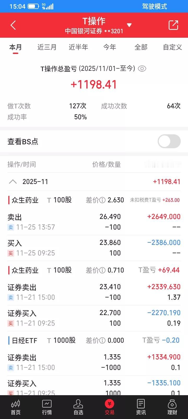 2025.11.25,今天t了100股众生药业,23.86买入100股,以26.49元卖掉,赚263元。当做了一天日结,比完全不动,还是好一点吧。