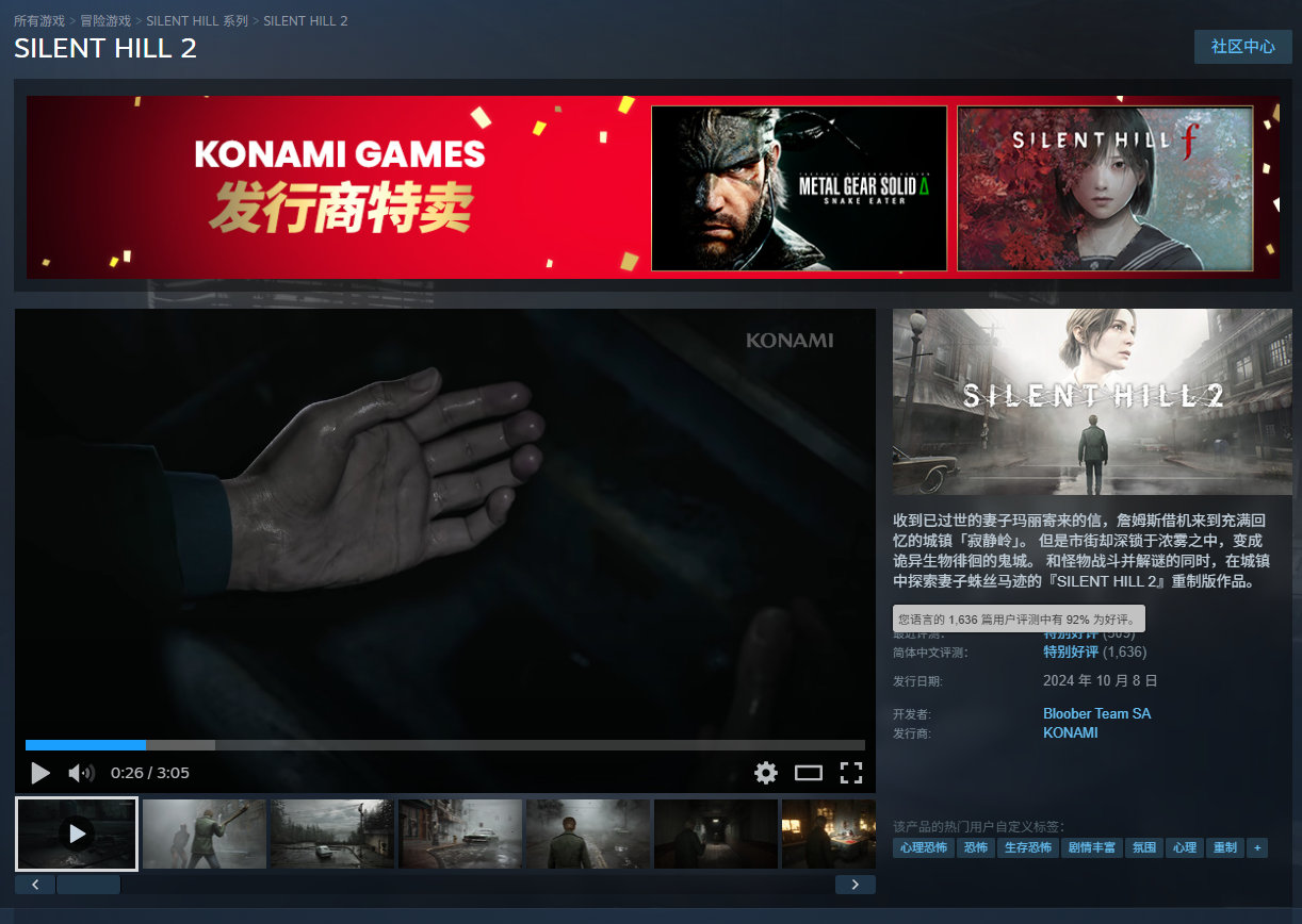 心理恐怖游戏《》目前在享新史低优惠,标准版折后196元,豪华版折后224元,12月9日截止,支持中文,国区好评率为92%,收录超1600篇玩家评测。收到已过世的妻子玛丽寄来的信,詹姆斯借机来到充满回忆的城镇「寂静岭」。 但是市街却深锁于浓雾之中,变成诡异生物徘徊的鬼城。和怪物战斗并解谜的同时,在城镇中探索妻子蛛丝马迹。