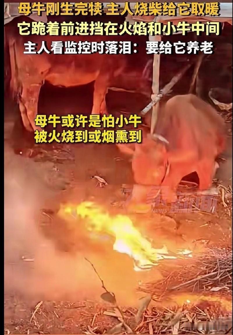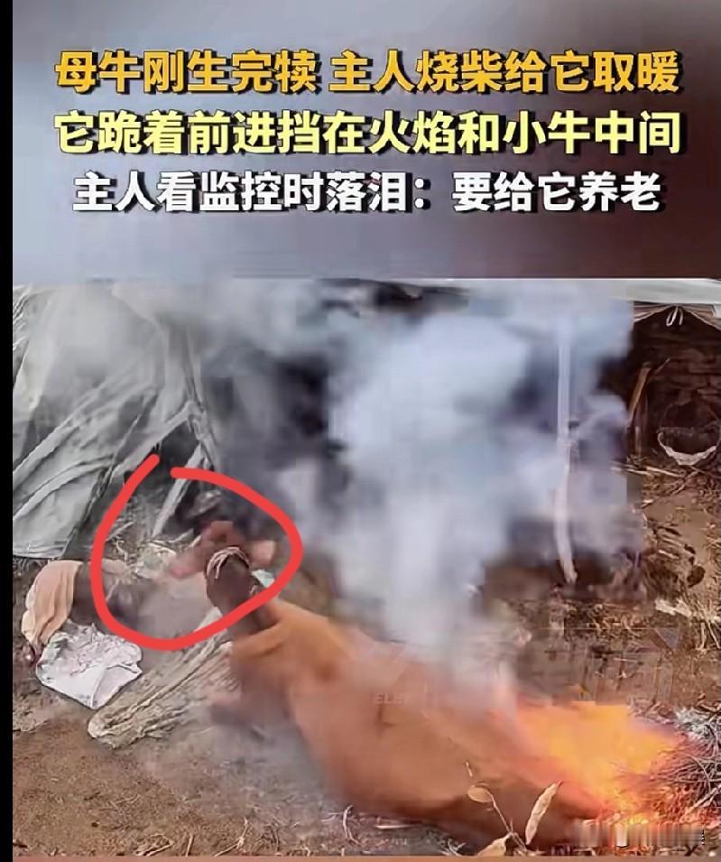 母爱不分物种,泪目了! 母牛刚生完牛犊,主人烧柴给它们取暖,但是牛犊在火源的下风
