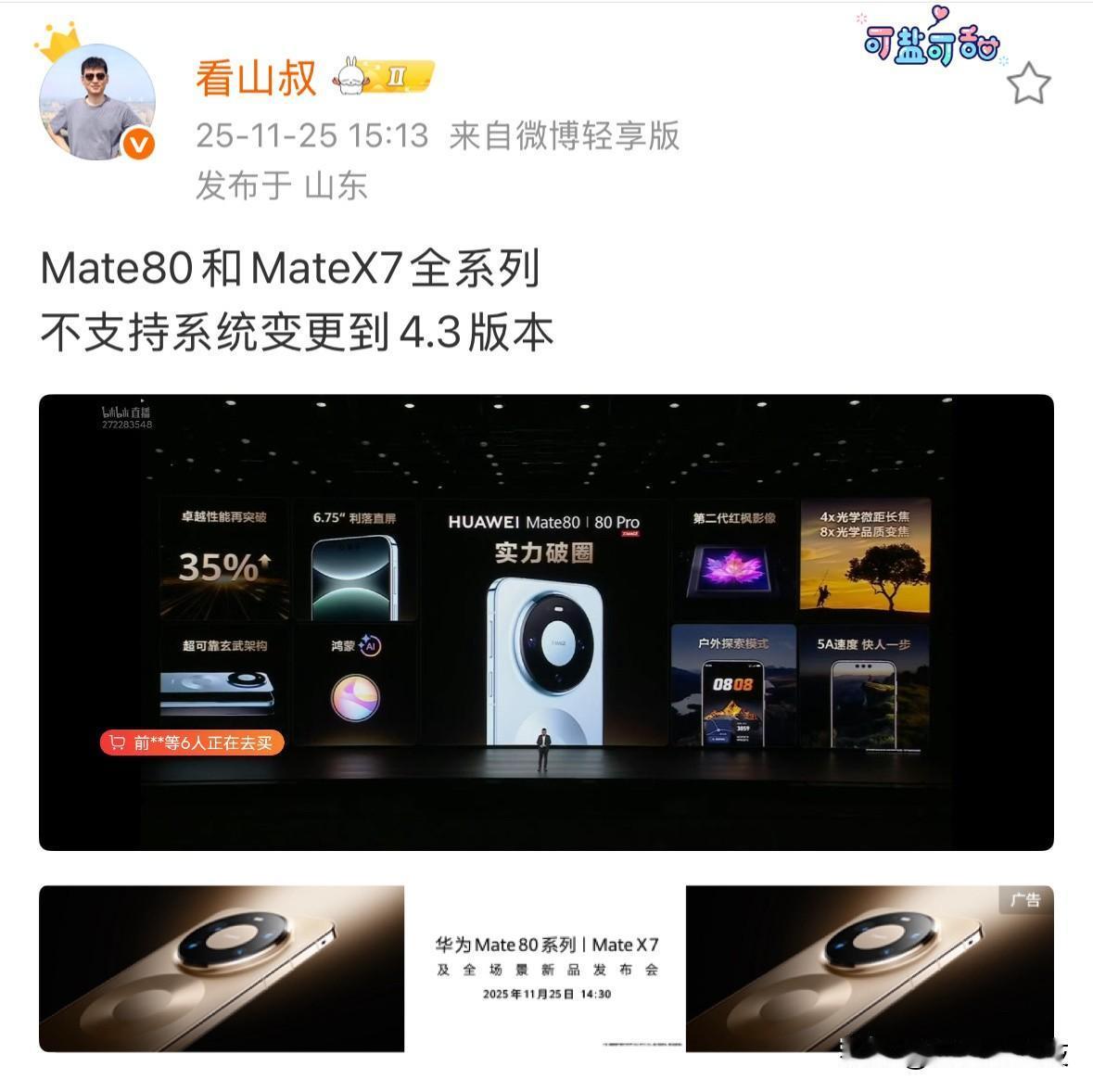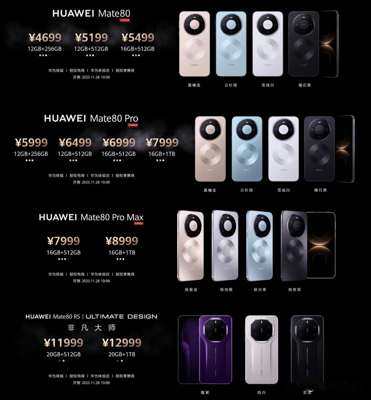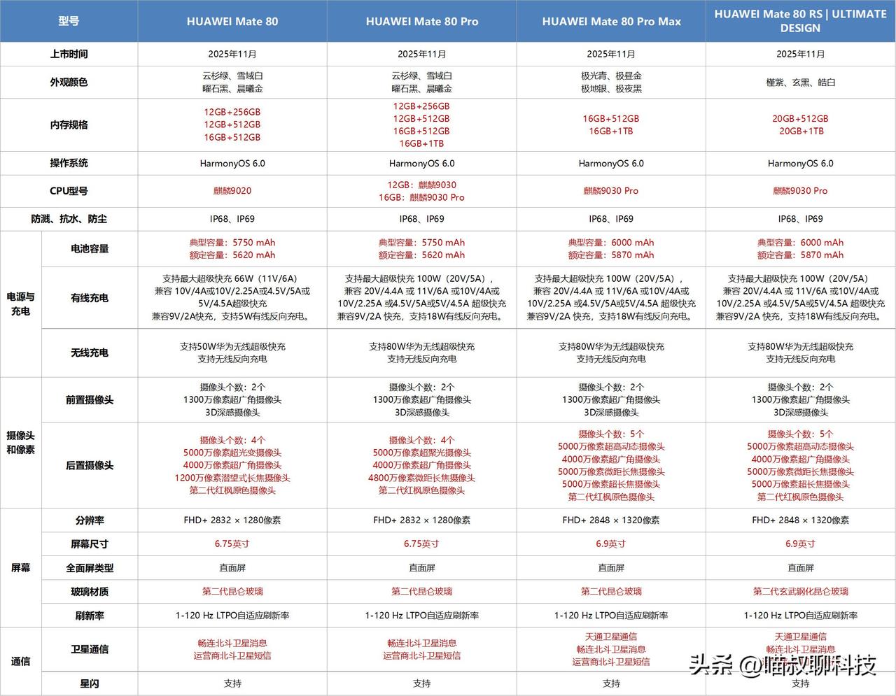 华为mate80系列价格虽然真香!但建议还是要慎重~ 有一说一这次的价格是真的劲爆,mate80标准版居然给做到了4699起,比70直接便宜了800块! 其他型号的起售价也都便宜了500快,在今年全面涨价的情况下是真的给力~ 而且这次还是全系3D人脸识别... 但是有些点也必须要注意! 1、标准版依旧是麒麟9020,Pro版本的12G运存和16G运存还分别采用了麒麟9030和9030Pro,想要体验到麒麟9030 高性能版本的成本并不低; 2、只有Pro max才是全金属一体化机身,标准版和Pro版本则是采用的锦纤材质(玻璃纤维增强复合材料)背板+哑光/亮面金属中框; 3、实际续航令人堪忧,虽然鸿蒙系统对于续航有一定优化,但6000毫安的电池在当下而言还是稍微小了一点; 4、目前不少机型的预售都已经到了25年1月底,需要等待的周期有点偏长; 5、这次全版本都不支持系统回退,纯血鸿蒙的有些软件的适配还有待加强。 不过总的来说还是能看出华为对于这款产品的诚意,虽然各个版本等级森严,但在不足5000的价位段就能体验到华为最新旗舰mate还是挺不错的。