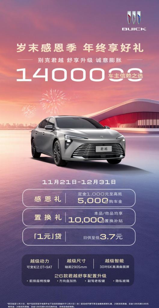 别克君越达成140万辆里程碑,推年末购车优惠 今天,别克君越在上汽通用汽车金桥基地迎来了第140万辆整车下线。这款历经四代进化的车型,在国内中高级轿车市场已走过了近20年历程。 为庆祝这一里程碑,别克推出了"岁末感恩季"钜惠活动。即日起至12月31日,消费者购买君越可享受三重优惠:支付1000元定金最高抵5000元购车款;本品或他品置换享受10000元品牌补贴;还能叠加至高15000元国家以旧换新补贴,综合优惠幅度相当可观。 2026款君越产品力也颇具看点,全系标配2.0T可变缸涡轮增压发动机与9AT变速箱,30吋曲面6K屏和高通骁龙8155芯片,并将方向盘加热、前排座椅按摩等实用配置下放至全系。 美系车的舒适与静谧仍是君越的突出优势。GL8同款座椅材质、5.4mm双层声学玻璃及ANC主动降噪技术,共同营造了越级的驾乘体验。在当前竞争激烈的市场中,君越通过“越级配置+诚意定价”的组合,展现了一款经典燃油车在新能源时代的坚守与突破。