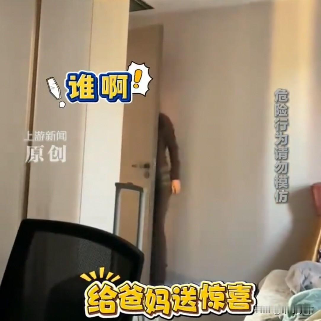 广东一女生休假回家,躲在门后想给爸妈惊喜。可爸妈见屋里不对劲,以为进了小偷。爸爸猛地推门,“砰”地撞在女生脸上,女生刚想喊人,第二下推门又紧跟着砸了过来。 11月22日,广东女生小琪休假,琢磨着给爸妈来个猝不及防的惊喜。 她特意瞒了三天,没透露半点回家的消息,拎着行李箱站在家门口时,心里早把爸妈惊喜落泪的画面脑补了八百遍。 掏出钥匙轻轻开门,屋里静悄悄的。 小琪先把行李箱藏进自己房间,又踮着脚溜进爸妈的卧室,眼睛亮晶晶地扫视一圈,最终选定门后当“藏宝地”。 为了完整记录下这温馨瞬间,她提前把手机架在衣柜角落,调好录像角度,才美滋滋地缩在门后,屏住呼吸等待。 “爸妈看到我,肯定会一把抱住我,还会说‘我的宝贝怎么突然回来了’!”小琪咬着嘴唇偷笑,手指忍不住轻轻挥舞,模拟着和爸妈拥抱的场景。 等了快20分钟,女生顿时有点心急了,正想出去看看,就听见了钥匙开门的转动声。 小琪立刻绷紧神经,把身子往门后藏好。 “咦?灯怎么开着?”妈妈的声音带着疑惑,紧接着,家里的小狗突然狂叫起来,尾巴竖得笔直,还一个劲往门后扑。 老两口对视一眼,瞬间警惕起来——出门时明明关了所有灯,现在客厅亮堂堂的,还有小狗反常狂吠,难道是进小偷了? 两人对视一眼后,开始分工合作。 妈妈小心拉开窗帘,父亲则挨个排查柜子、门后等藏人角落。 卧室门后,女生见爸妈还不进来,有点心急的她,悄悄动了动。 卧室门传来的动静瞬间吸引了老俩口的注意力。 两人蹑手蹑脚挪到卧室门口,爸爸耳朵贴在门上听了听,隐约听到里面有动静,心里更确定是小偷藏着了。 他回头跟妈妈使了个眼色,深吸一口气,猛地发力,朝着门狠狠一推——“砰!” 一声巨响,门板结结实实地撞在小琪脸上。 “啊!”小琪疼得眼泪瞬间涌了上来,眼前一阵发黑,刚想张嘴喊“爸妈”,还没等声音发出来,爸爸以为“小偷”在里面反抗,又使劲补推了一下门! “砰!”第二下力道更足,小琪直接被撞得失去平衡,“扑通”一声摔在地上。 “呜呜呜……是我啊!爸爸!”小琪捂着生疼的嘴,眼泪鼻涕一起流,坐在地上哭得直抽抽,声音都带着哭腔。 这声呼喊让老两口瞬间僵住。 爸爸愣在原地,手还保持着推门的姿势,妈妈赶紧凑过来,小心翼翼地拉开门。 看到坐在地上捂着脸哭的女儿,两人同时瞪大了眼睛,异口同声地喊:“琪琪?你怎么回来了!” 老两口看见女儿手捂着嘴巴眼泪掉个不停,意识到闹了乌龙了,讪讪地笑了笑,原来不是小偷进家了,而是自家宝贝女儿回来了。 女生偷偷回家想给爸妈惊喜,反倒被当小偷“暴击”,又疼又好笑。这也提醒了我们:惊喜得选对方式,不然也太疼了。