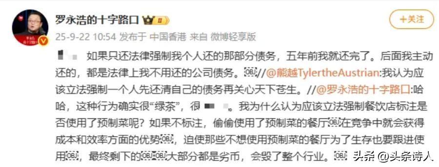 罗永浩,被执行715万,锤子科技又上“老赖”名单! 715万执行标的刚曝光,但罗永浩的还债故事比电视剧还魔幻——欠6亿竟还了8.24亿?! 老罗亲自拆解“真还传”真相: 🔥直播电商狂赚5.48亿现金 🔥手机团队卖字节跳动捞回1.8亿 🔥甚至靠变卖物料硬凑6600万抵债 最扎心的是——他早就不用替公司背债了!这5年多还的全是“情义债”,法律上本可潇洒走人。 如今他放话要“兴风作浪”狂赚钱 网友辣评:“论还债,罗永浩比贾跃亭体面一万倍!” 这场当代“爷们儿之战”,你看好吗?