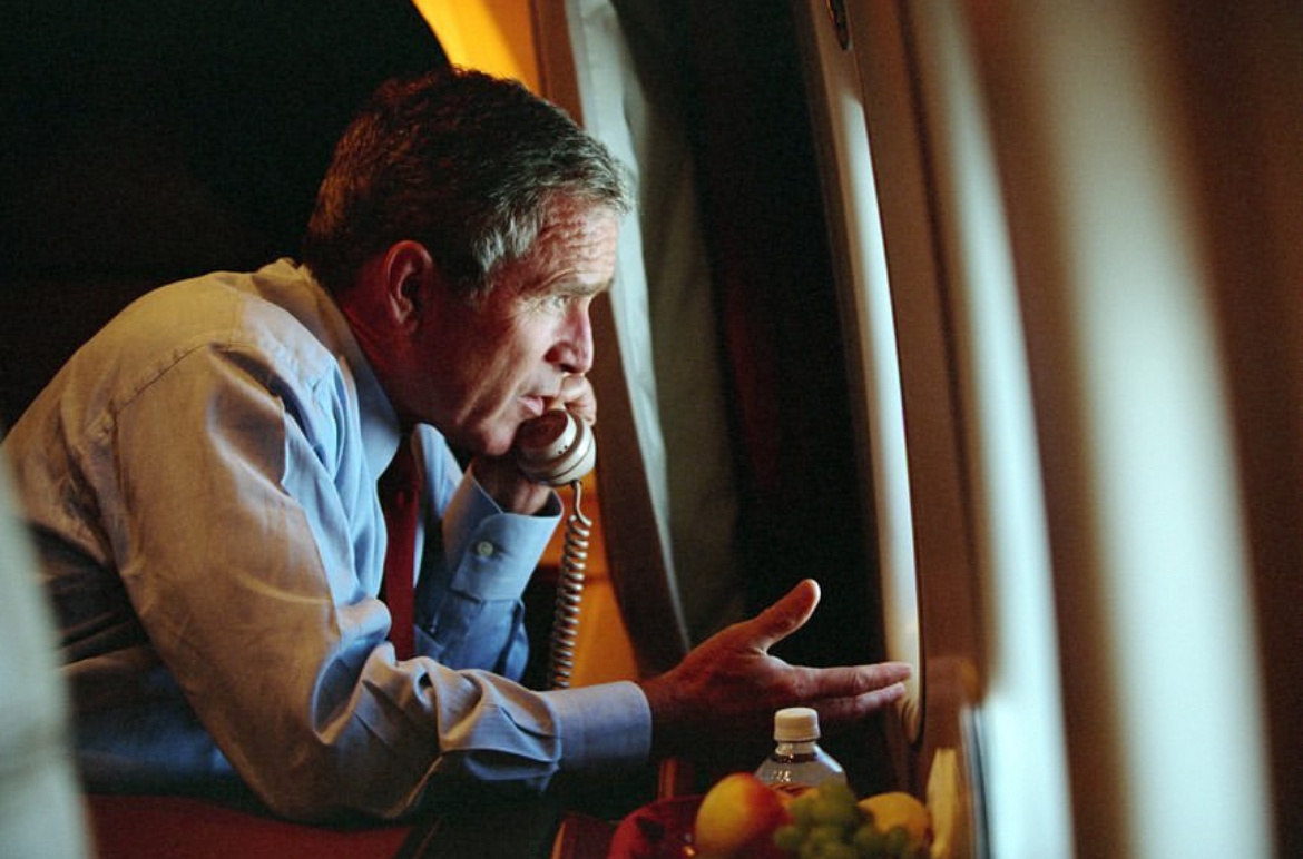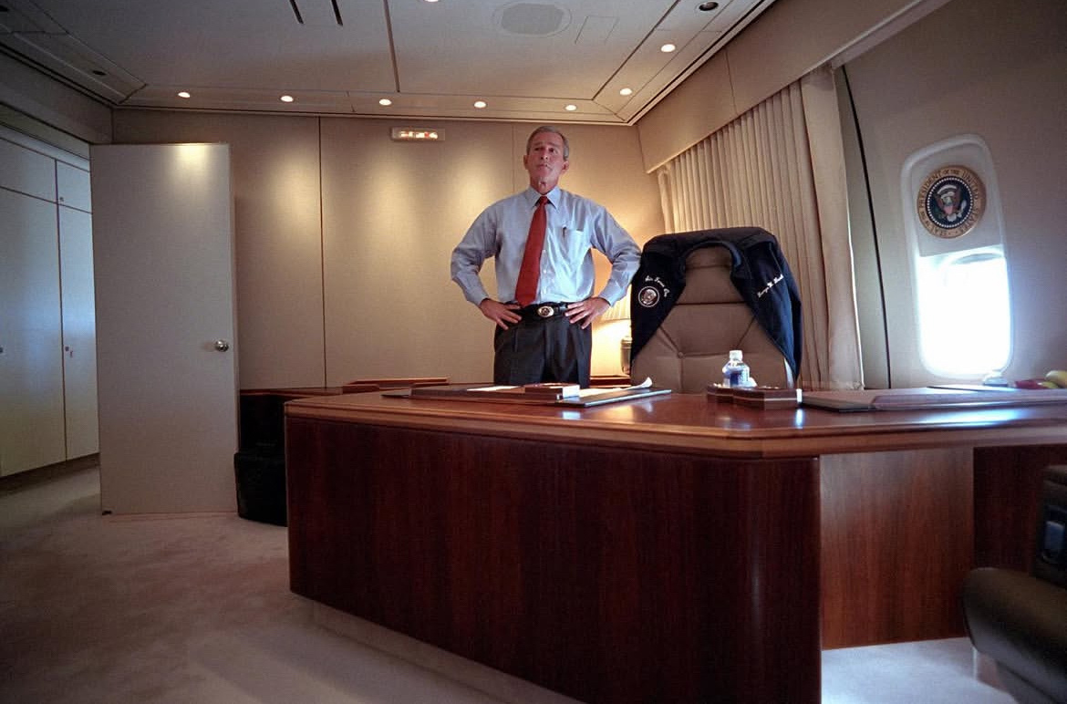 【来自投稿】图一二 2001年9月11日上午,正在佛罗里达州一所小学里推广教育改革计划的小布什,接到了两架客机撞击纽约世贸大厦的消息,立刻將该小学的一个空房间设置为临时办公室,和国家安全顾问,白宫幕僚在此紧急协商 图三四 登上空军一号后忧心忡忡的小布什 图五 因担心空军一号受到袭击,附近的空军基地紧急起飞两架战斗机为空军一号护航 图六七 空军一号飞到华盛顿上空时,所有人都看到了刚刚遭遇撞击,正浓烟滚滚的五角大楼
