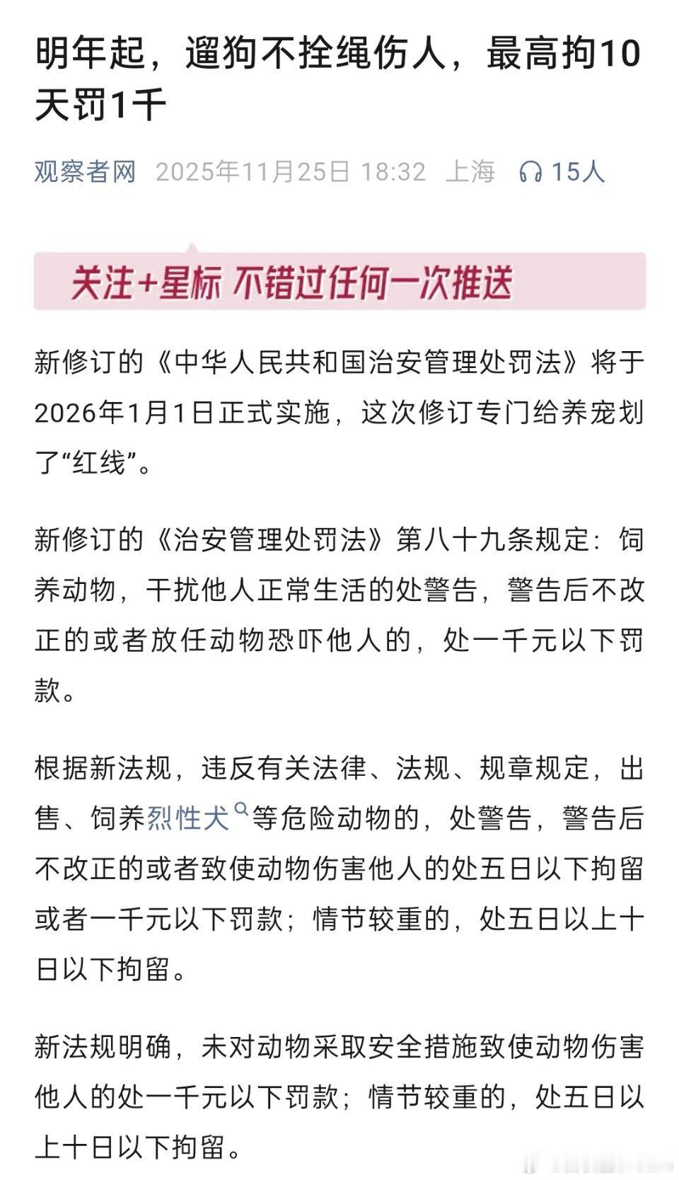 终于与国际接轨了!流浪猫狗或者宠物扰民问题可以得到解决了,动物伤人可以拘留。明年起,遛狗不拴绳违法了!遛狗不拴绳伤人的,最高拘10天罚1千。动物没伤人却大叫扰民的,罚1000元以下!新规定里有一个非常关键的文字:「饲养动物,干扰他人正常生活的处警告,警告后不改正的或者放任动物恐吓他人的,处一千元以下罚款。」那问题来了,猫在物业小区里叫春算不算扰民?狗在大街上乱跑算不算扰民?那些在小区里散养猫,在学校里投喂流浪狗的算不算饲养动物?第一次警告,第二次直接罚款。理论上来说,有动物,有饲养人,有人投诉被干扰正常生活,并且饲养人身上有多条被投诉的记录,经常饲养动物被投诉扰民,应该就能罚款了。即使饲养人声称不是自己的宠物,但饲养行为是存在的,而且每次都因为饲养不同的动物被投诉,那就是明显的屡次警告后拒不改正。