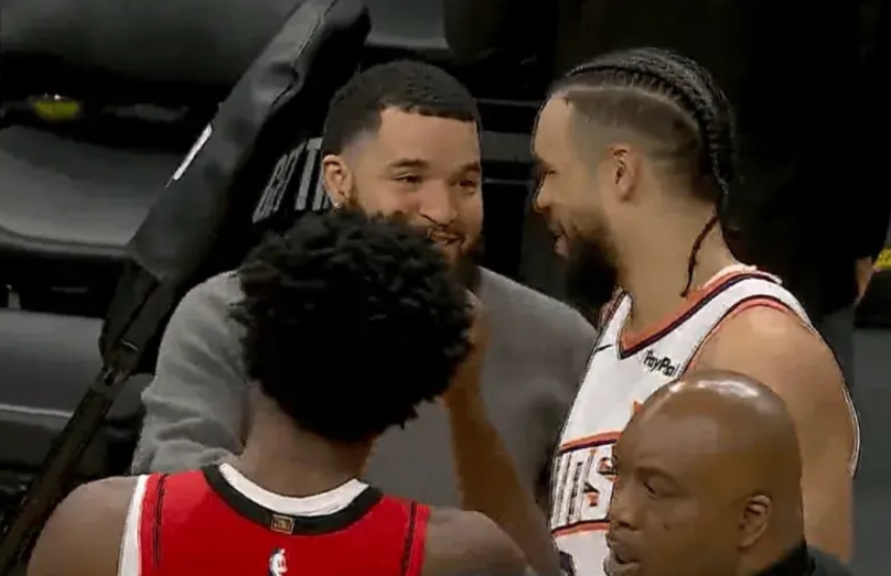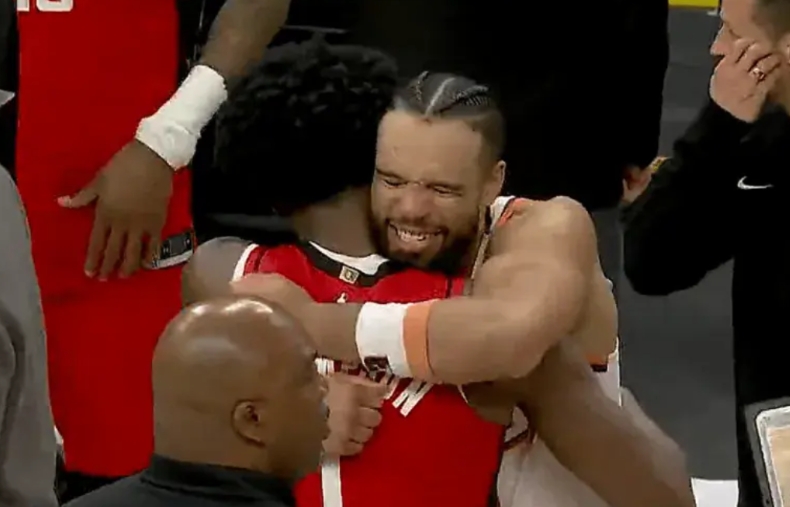 赛后也看到了温馨一幕,狄龙和每位火箭球员拥抱致敬,尤其是搂着老范在那里聊,关系真不是一般的好,在场上较劲不耽误场下是朋友,像样!