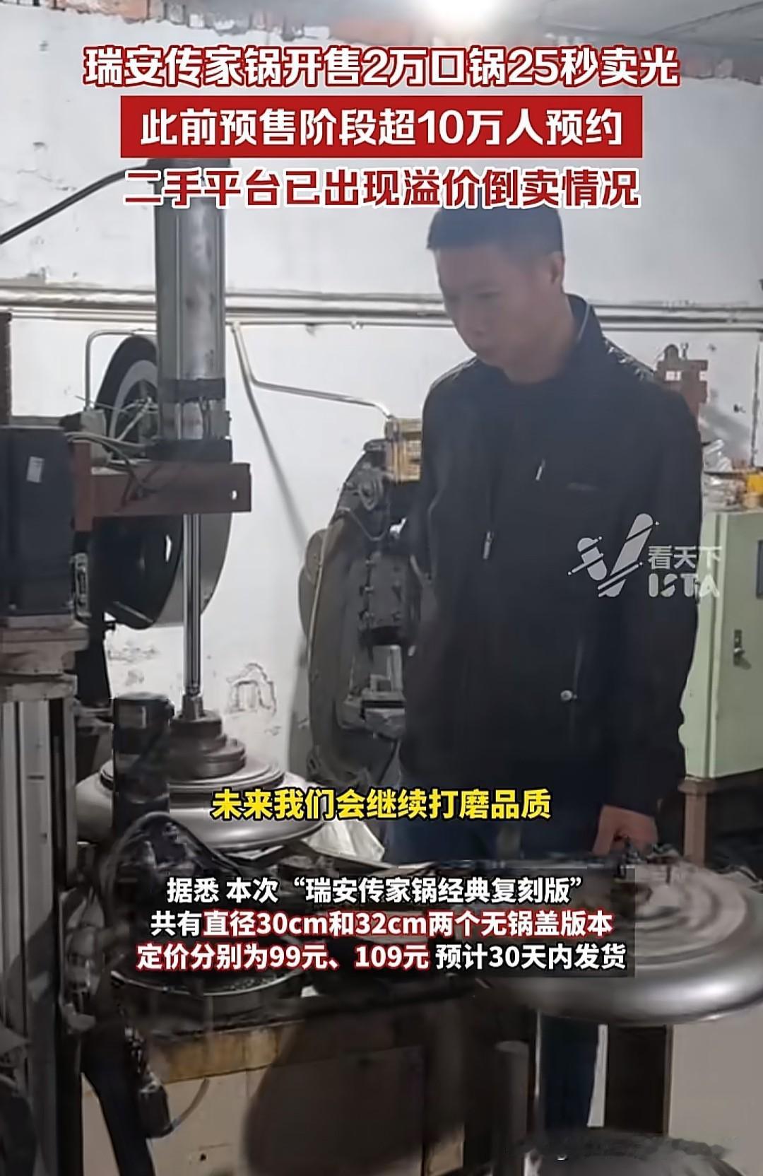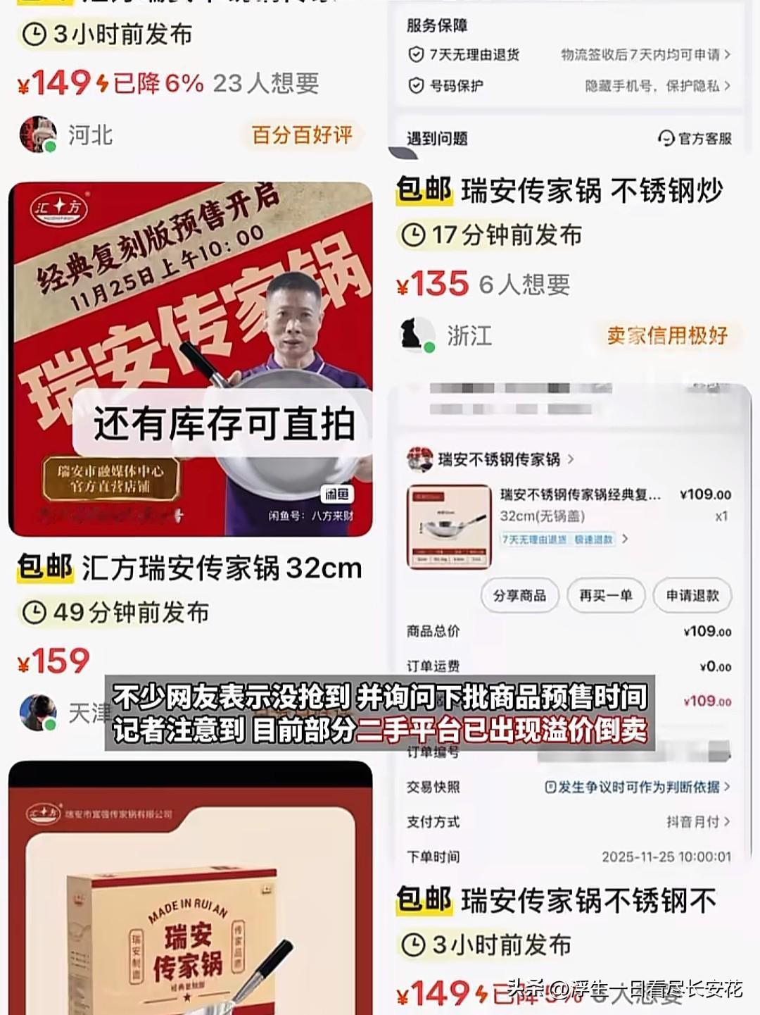 瑞安传家锅一上线就被抢光了,可见这锅有多火爆了,但明眼人都知道这锅即便质量再好,价格顶多卖到69元或者88元,而且还没有品牌溢价,卖到49元也是有利润空间的。 但问题就出在这锅太火了,知名度太高了,依然该有炒作的空间,因此二手平台有很多人加价出售这种锅。补货是不是正品就不好说了,本来流通的锅有2万口,用上新锅的恐怕要远远高于这个数。 市面上的铁锅都是几十块钱,只要厂家用了心,质量都还是可以的,但是要把铁锅卖到99元这个价,对大多数人而言还是不太能接受的。
