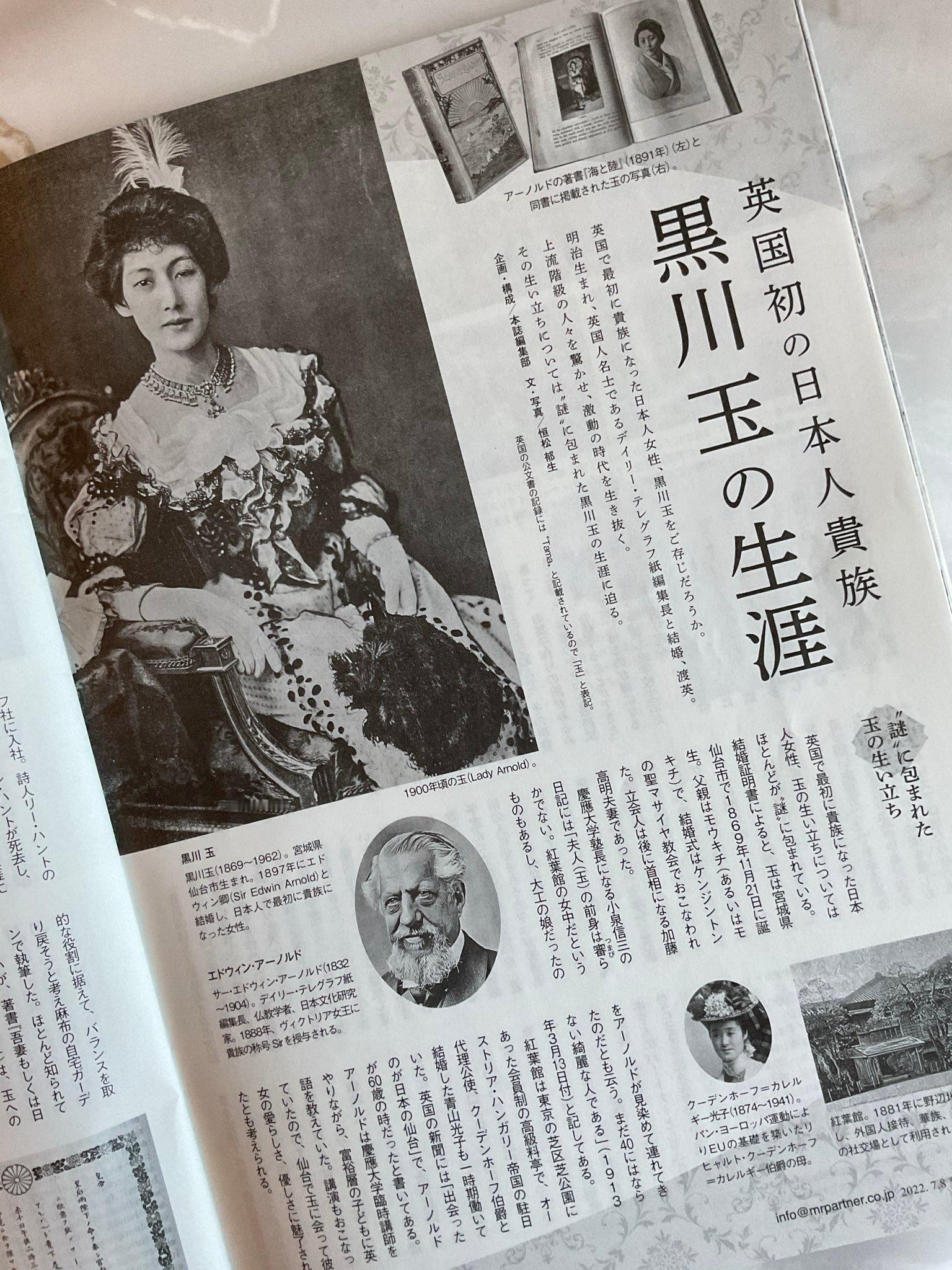 出生仙台的黑川玉( Lady Arnold 1869–1962)是 Edwin Arnold爵士(1832-1904)的第三任妻子。 说黑川玉是第一个嫁给英国贵族的日本女性,有点抬高了。阿诺德叙爵印度骑士团的骑士( KCIE CSI),还没到“贵族”的身份。