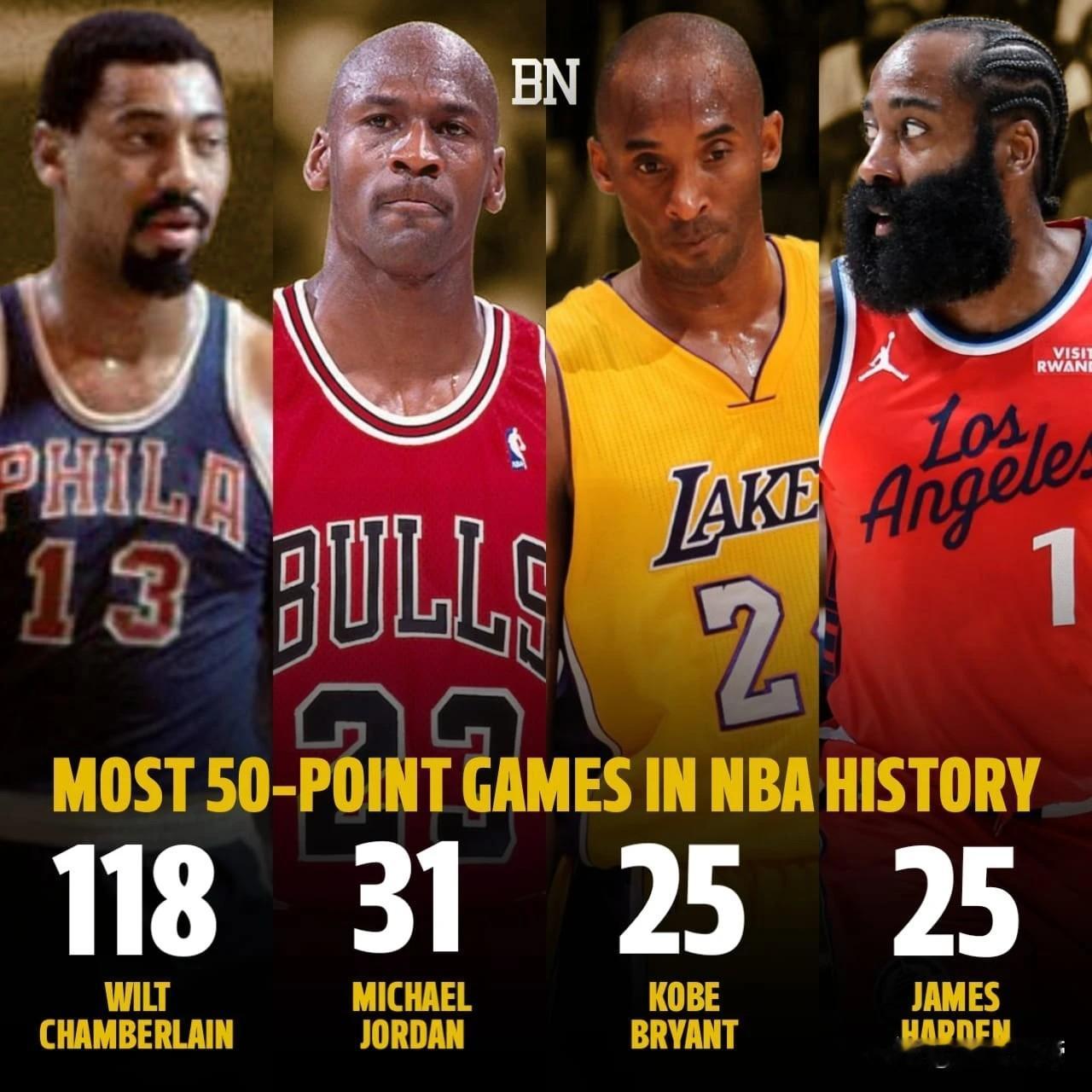 距离乔丹还差6次,哈登还有机会再拿50+得分吗? 在现役球员中,哈登是拿到50+得分最多的球员,目前总共拿到了25次50+得分,排名第二的是库里的15次,詹姆斯目前拿到了14次,杜兰特则仅仅只有9次。 哈登目前已经追平了科比的记录,但是距离乔丹还差6次,以哈登目前的状态,本赛季感觉至少还能拿2次了,以后每个赛季再爆发一次,退役之前超越乔丹还是很有希望的。 不过排名第一的张伯伦就太变态了,竟然有118次,现役所有球员都加起来也没有张大帅一人多了,这绝对是前无古人,后无来者了。