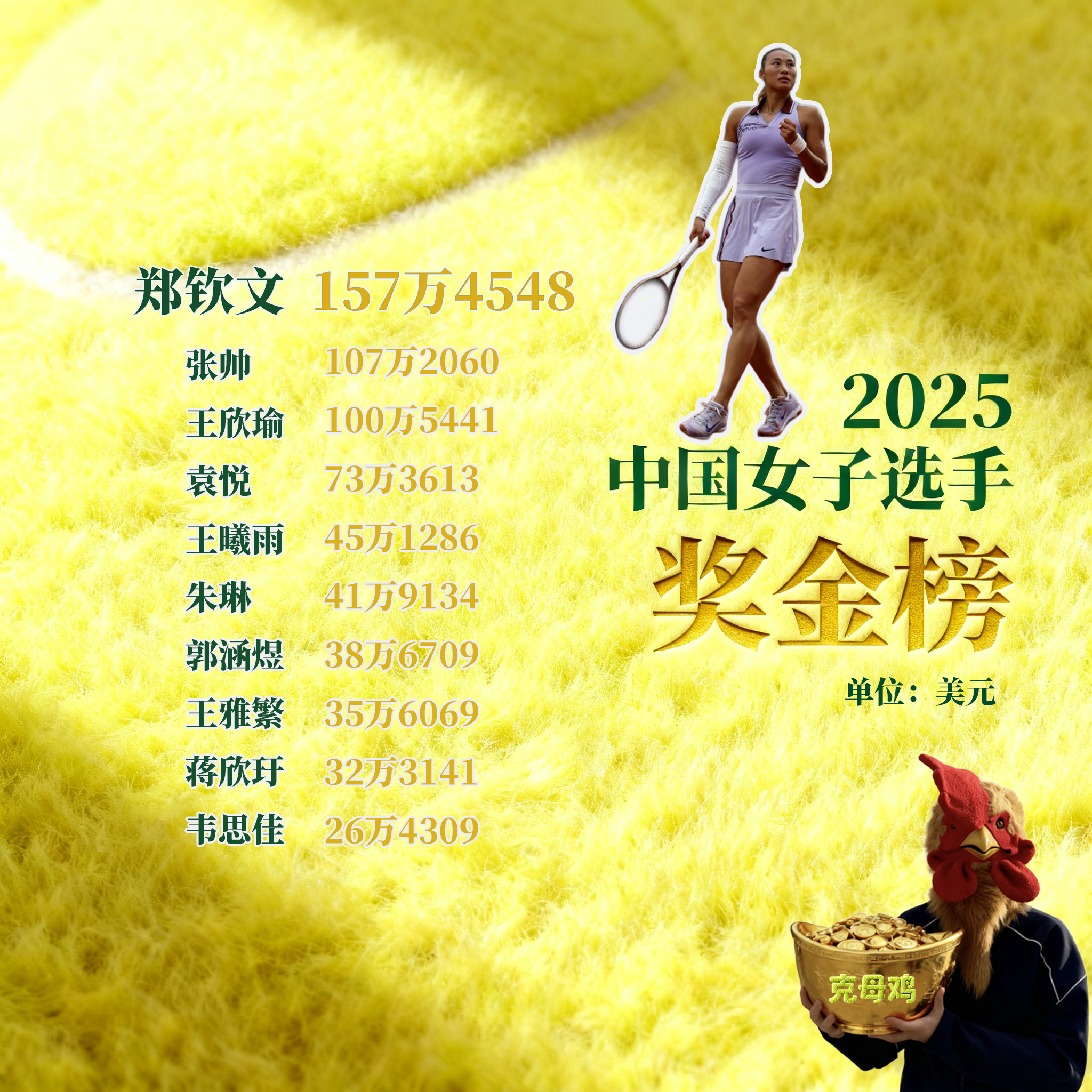 🎾 系列开启,先来回顾本年度中国大陆女子球员奖金榜前十名💰1️⃣郑钦文 157万45482️⃣张帅 107万20603️⃣王欣瑜 100万54414️⃣袁悦 73万36135️⃣王曦雨 45万12866️⃣朱琳 41万91347️⃣郭涵煜 38万67098️⃣王雅繁 35万60699️⃣蒋欣玗 32万3141🔟韦思佳 26万4309单位:美元