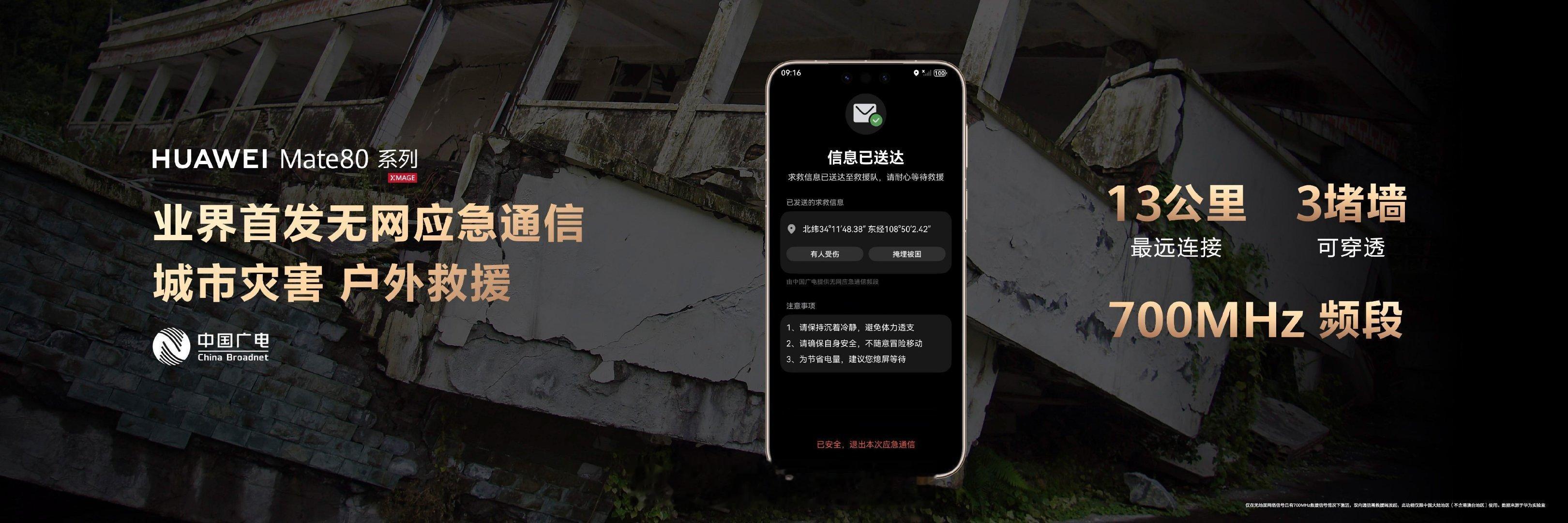 华为 ,业界首发700MHz无网通信,在地震、洪水或是野外失联等断网险情下搭建生命通道,打通用户与救援队最后一公里的沟通链路。700MHz应急频段救援信号,可以穿透3层楼的深度,覆盖超过13公里的通信距离。