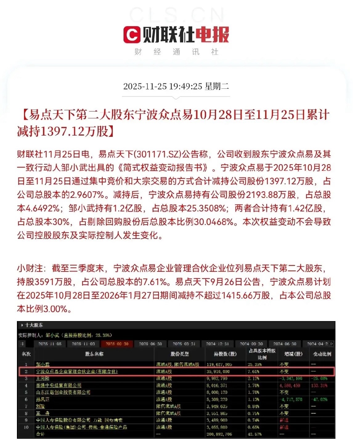 易点天下突发公告!第二大股东宁波众点易10月28日至11月25日累计减持1397.12万股减持的真快啊,此前公司公告是三个月减持完,现在一个月不到就成功全部减持了,个人认为易点天下的二股东必须要做面锦旗送给拉升的游资,感谢拉升的游资,感谢拉萨团结路,正因为你们的积极参与,精准点火易点天下,才使得公司股东们能在高位精准减持,不禁让人感叹一下,上市真好啊,做股东真香啊,高位减持真是太美妙了!5.4万易点天下的中小股东,坐稳扶好,受此消息影响,易点天下恐怕要迎来大震荡行情了,接下来该怎么办,应该心里有数了吧!