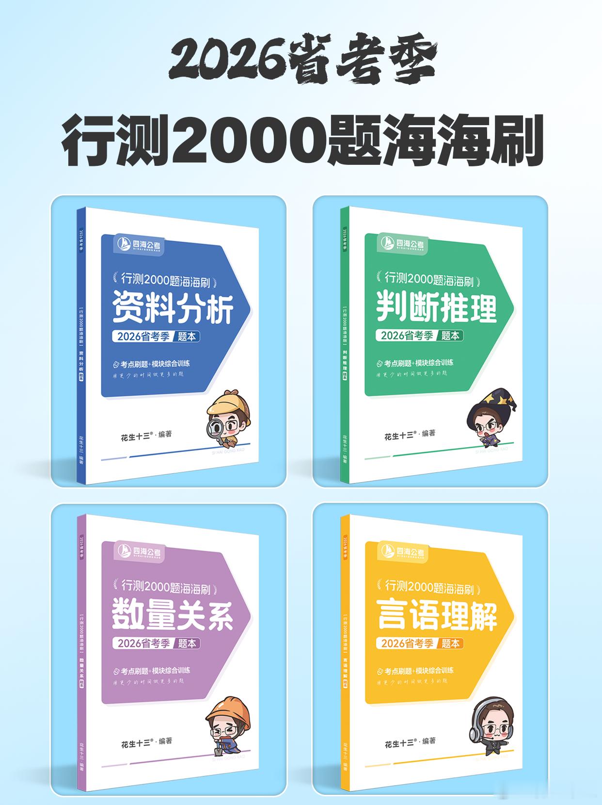 四海公考2026省考系列课程说明介绍本轮课程“2026省考笔试全程刷”共计三个阶段,分为模块刷题训练、考前1期套题冲刺和考前2期套题冲刺。价格说明:行测2000题海海刷(193元)+套题1期冲刺(293元)+套题2期冲刺(293元)=699元(联报价格)上架时间:2025年11月26号下午(各平台及“四海公考”)第一阶段————《行测2000题海海刷》课程周期:12月10号-1月17号(全程38天,包含7天周日休息)课程设置:行测资料分析、判断推理、言语理解、数量关系4个模块刷题,共计2000题。讲解方式:先刷题后讲解,每天2节直播课(上午、晚上),每节时长约2小时。由我和四海其他四位老师(砰砰、麦朵、拾伊、柳岩)共同授课,但每个科目我都会进行讲解,行测海海刷共62节课,其中44节课由我亲自授课。课程附赠:纸质刷题讲义(4本)、资料分析600题、逻辑判断600题、片段阅读600题、数量关系600题、定制笔记本、定制精美周边、订制贴纸、纸质课表。题目选择:“行测2000题海海刷”所选题目,与26国考套题班、各模块600题刷题书籍题目无重复,所选题目难度为中等偏难。关于申论:刷题阶段虽然没有安排申论课程,但申论会以连续的“全勤全返”早课形式和大家见面,全部由飞扬老师亲授。PS:花生老师建议大家,跟着我们今年课程节奏复习备考,对于今年比较新的题目,自己先不要做,留到考前套题阶段,我们做一起冲刺!第二阶段————《省考冲刺1期套题班》课程周期:1月19号-春节前课程设置:12套行测试卷+6套申论试卷讲解方式:套题阶段由我和飞扬老师进行讲解。套题冲刺课是四海核心提升课,考前套题阶段会给大家邮寄纸质试卷,包含最新题目,通过大量的模拟考试和复盘讲解进行考前冲刺,在讲解中找到自己的不足,全方位提升自己的笔试能力。课程附赠:行测试卷12套、申论试卷6套、行测答题卡、申论答题卡、纸质课表。题目选择:精选近年题目组卷,包含最新题目。第三阶段————《省考冲刺2期套题班》课程周期:春节节后课程模式:2期题目与1期题目不同,其他模式皆相同PS:暂定12套行测试卷+6套申论试卷,会根据省考笔试时间略有调整关于发货:今年刷题课程讲义将会分为三批进行邮寄,同学们下单后,首先会将赠送的四本600题发出,第二批将会发出资料分析、判断推理两本纸质刷题讲义、周边、笔记本、打卡贴纸和课表,最后一批将会发出数量关系、言语理解纸质刷题讲义,为避免开课前集中下单导致快递无法按时收到,花生老师建议同学们尽早下单,下单即邮寄第一批讲义。