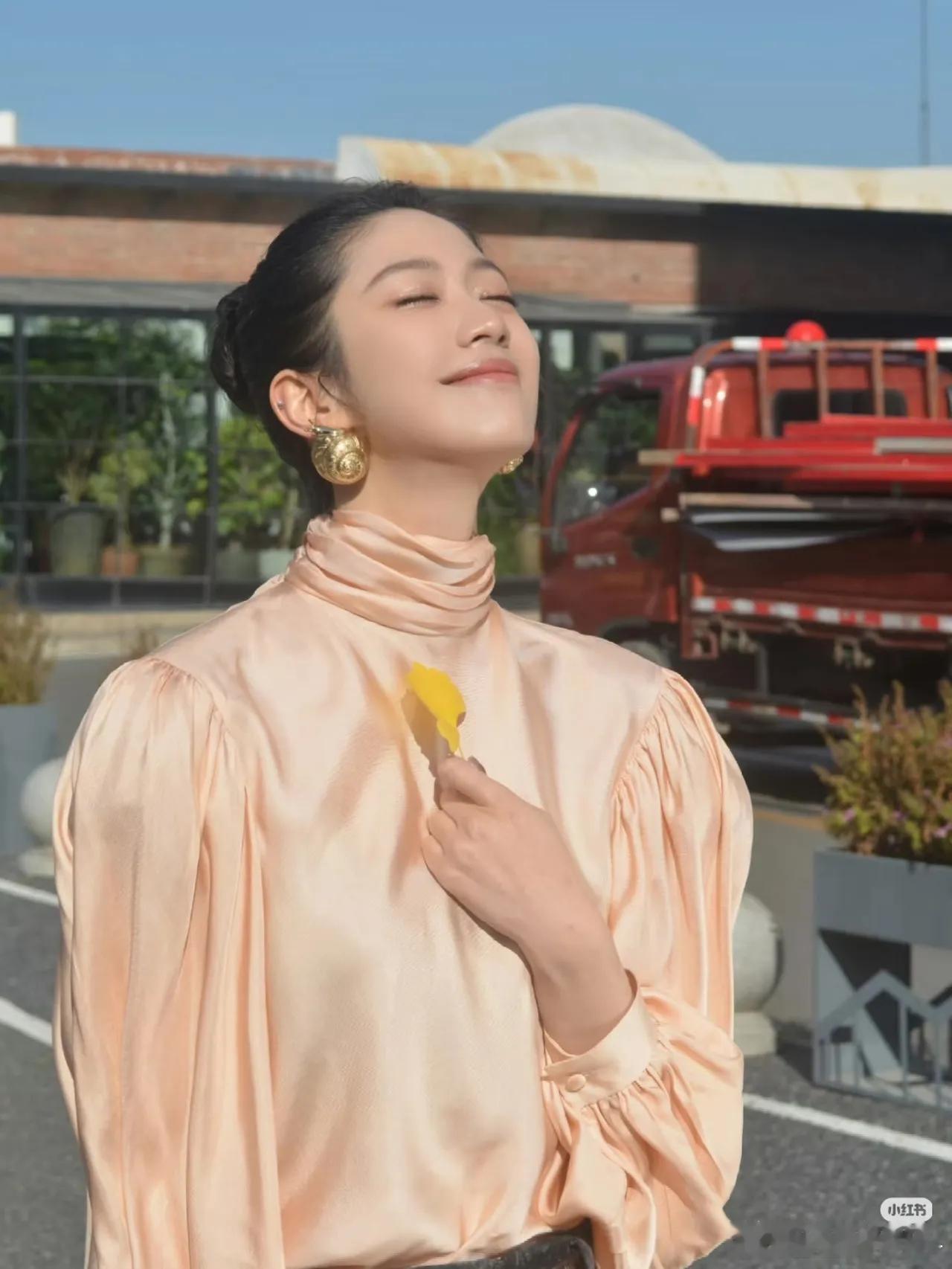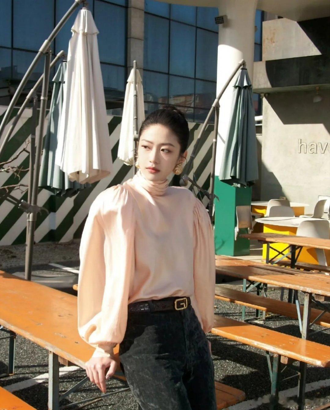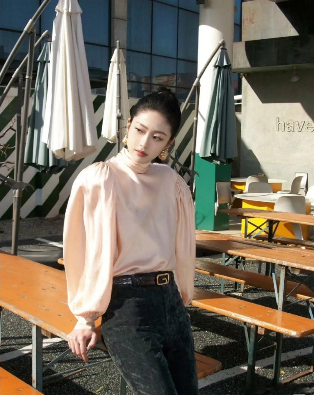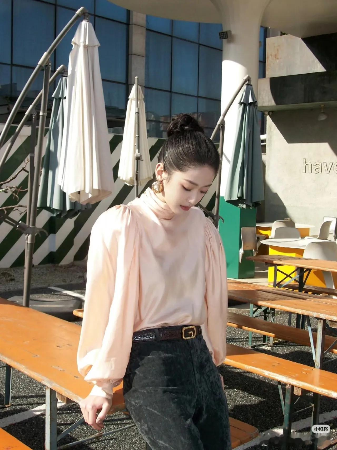 向涵之把韩系财阀千金穿搭模板演绎得淋漓尽致!这组造型将“静奢松弛感”完美诠释——缎面裸粉衬衫自带柔光,泡泡袖配高领尽显贵气,复古金耳环与G扣皮带点缀出低调奢华,冷白皮在阳光下更显耀眼,千金范儿十足~