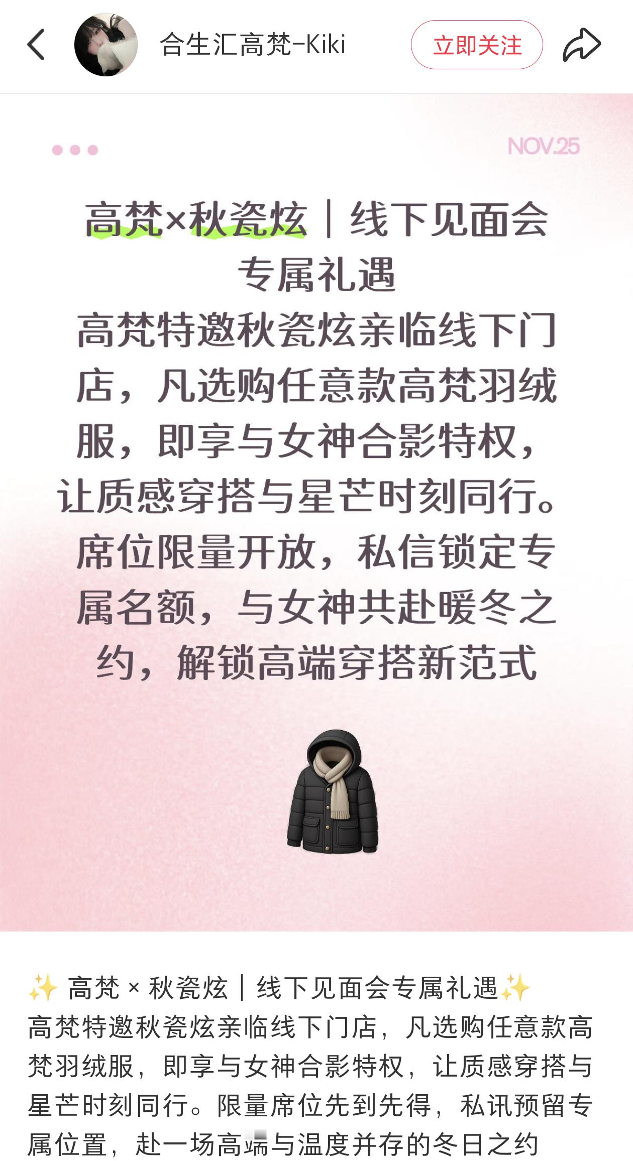 ✨11月29日14:00,在北京朝阳合生汇选购任意款高梵羽绒服,即可有机会与 合影