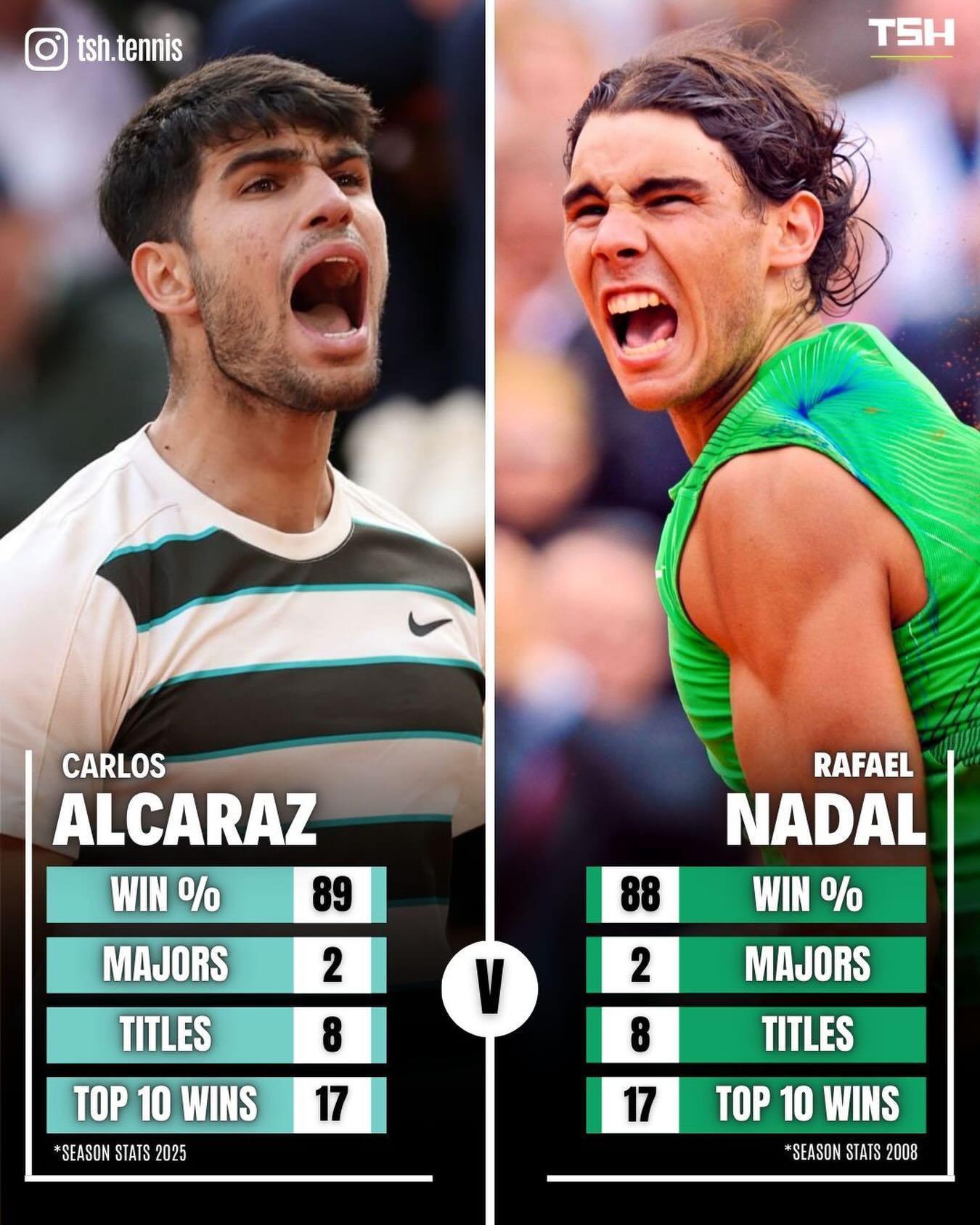 22岁的阿卡在2025赛季的数据,与22岁的纳达尔在2008赛季的数据,这么一对比,天选接班人的地位更稳了。表格上没有体现的是,这两个赛季,纳达尔和阿卡都成为了年终世界第一。隔年的2009赛季,纳达尔拿下了澳网冠军。。。现在,压力来到阿卡的身上了