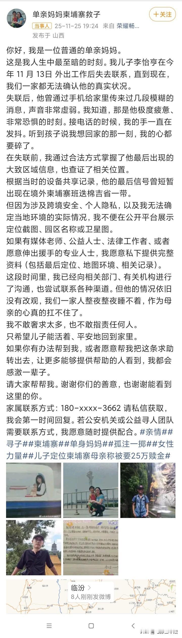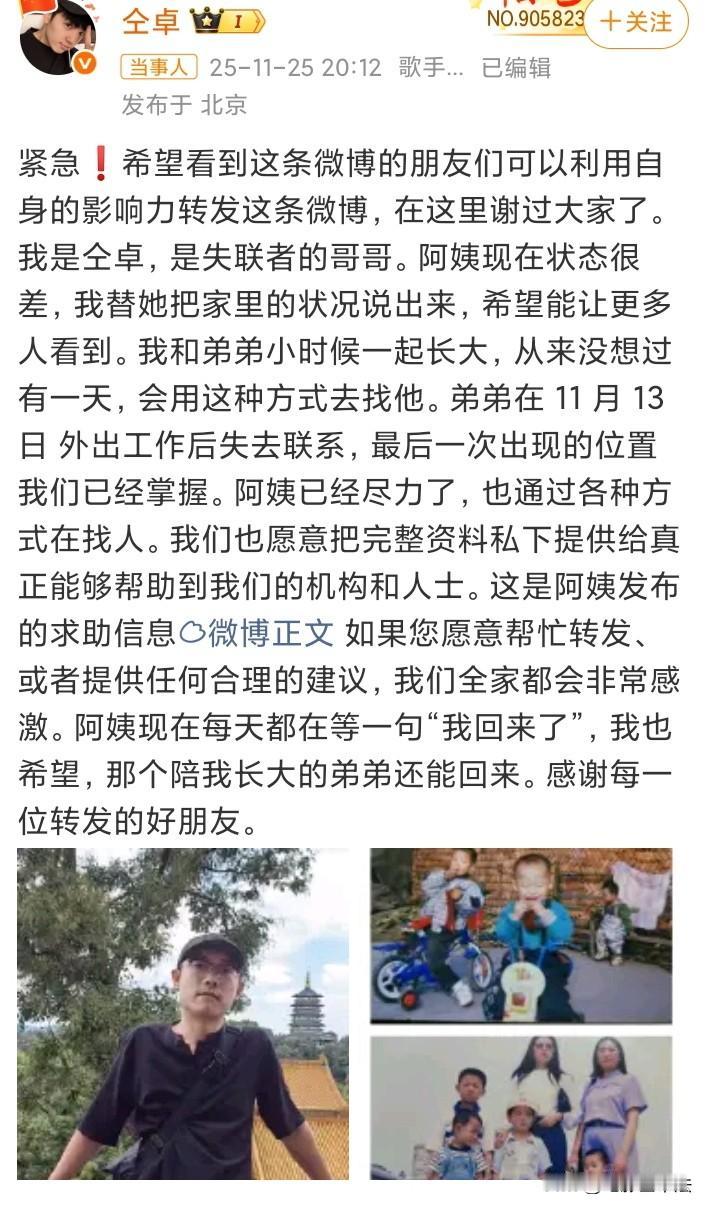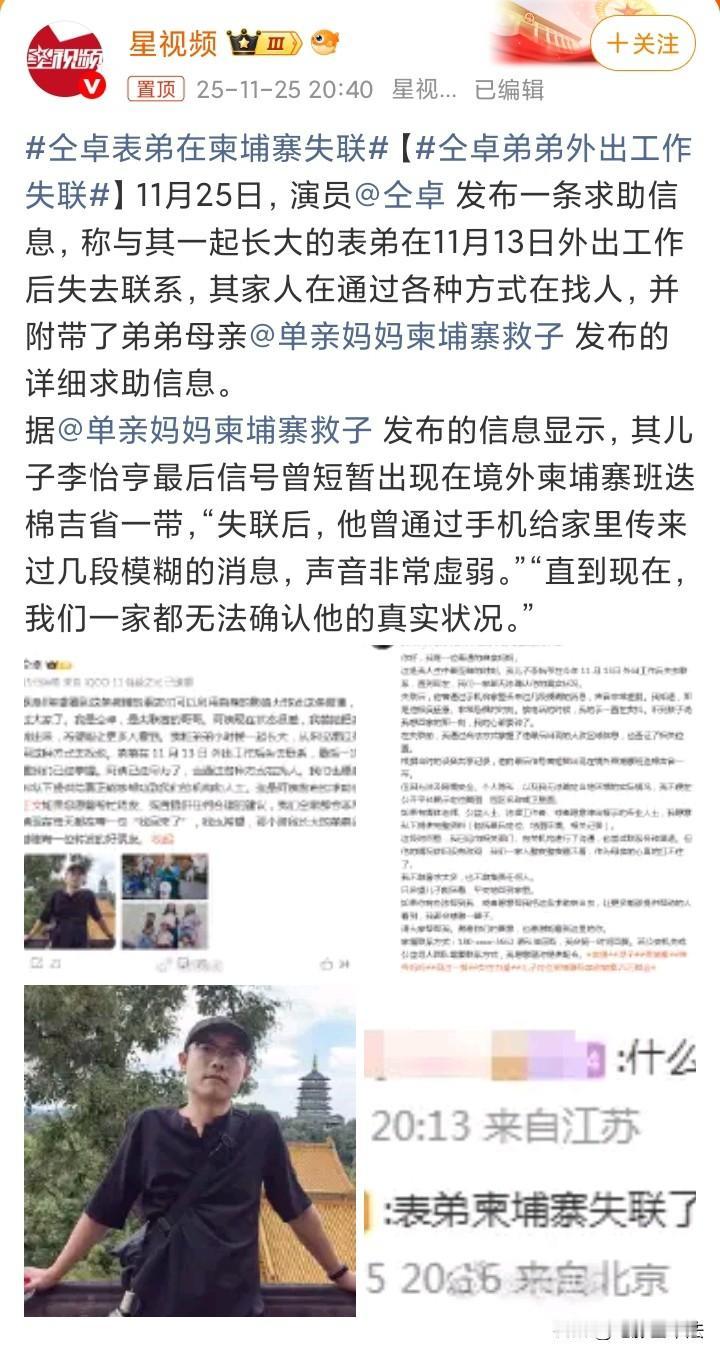 仝卓,紧急发文! 11月25日,久未露面的仝卓意外发文了,开头居然用了紧急二字,看完全文才知道,原来他的表弟,阿姨家的儿子外出找工作后失联了,而表弟失联前最后出现地点是在柬埔寨! 网友们纷纷评论: 仝卓虽然有污点,但从人道主义角度出发有必要帮忙宣传。 说多少次都拦不住一些人的发财梦。 都多少年了,这时候去那的,是主动的还是被动的? 是正规工作签吗,不是的话别浪费大家精力。 所以他是跑那边去的还是被绑过去的? 明知山有虎,偏向虎山行,作为成年人,不知道东南亚多危险? 还去东南亚,总有人有侥幸心理。 现在诈骗新闻满天飞,怎么还是那么多人前赴后继? …… 仝卓说表弟是因为找工作去柬埔寨的,那就让人搞不懂了,这年头居然还有去柬埔寨找工作的?哎,不管如何,希望人能尽快找到! 前几天看到有个国内明星因为近期风评不好不敢在国内高调,于是去东南亚搞粉丝见面会,让国内粉丝千里迢迢去人生地不熟的国家,粉丝大多数还都是小女孩,去东南亚真的很危险,这种见面会应该被禁止!