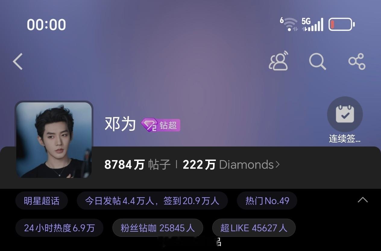 晚上好呀,小仙来啦,不带间断的邓为超话昨日发帖4.4万+,超like4.5万+钻石们真的好好,热情善良充满正能量。邓为优秀值得