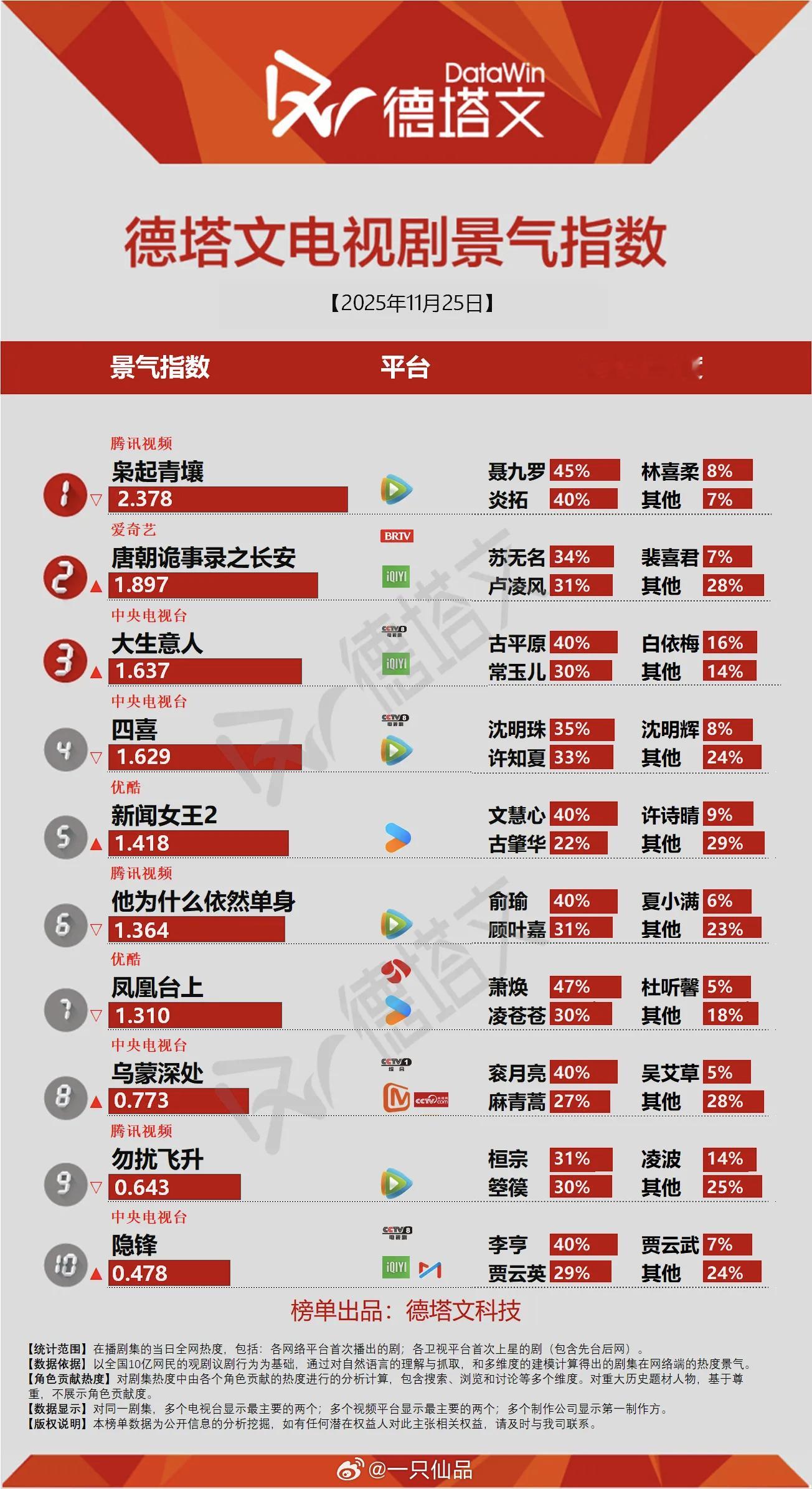 今日德塔文在播剧景气指数榜迪丽热巴《枭起青壤》继续登顶top1我们枭起就是这样越
