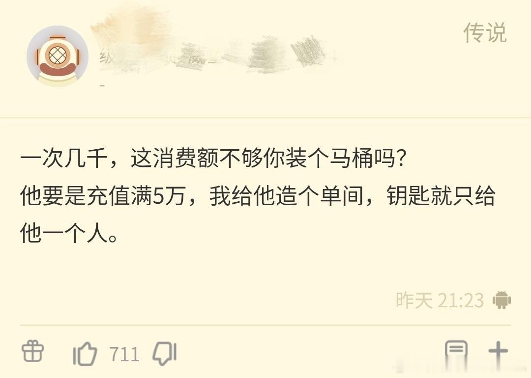 刷到一个非常抽象的帖子,一位电竞馆老板声称有位男客人每次方便总是往女厕所跑,刚开始我还以为他八成是碰到坏人了,看到后面直接绷不住了。原来电竞馆厕所都是单间,男厕所只有蹲坑,女厕所装了马桶,而这位客人恰巧膝盖有点毛病。电竞馆老板表示这位客人每次充值都是两三千,所以不想闹太僵,问大家应该怎么办。恕我直言,这就是典型的既想赚人家钱,又不想服务好人家。你要是无法接受膝盖不好的客人使用店内马桶干脆就直言相告,要是觉得这事儿能办就赶紧去给男厕所装马桶,这么浅显的道理还至于上网问吗?人家充值动辄两三千块,你多装个马桶能用多少钱啊?下面留言倒是挺实在,有网友讲要是有人充值满五万,他愿意给客人另开独立单间。电竞馆这赛道做的就是熟客生意,这年头买卖不好干,实体小老板遇见愿意支持自己的老主顾恨不能把心掏给人家。据我所知现在很多电竞馆碰到充值多的本地大哥基本都会赠送零食饮品,甚至还会免费开放自选外设,因为不装马桶发帖吐槽顾客的我还真是第一次见,快长点心吧!