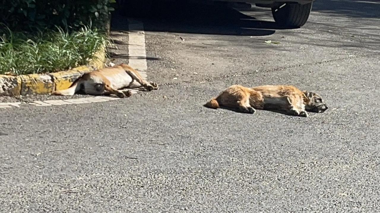 这是嘎了还是嗮太阳呀 刚下楼 就看到两只狗横在地上 这不晓得是嘎了 还是在晒太阳 我也不敢凑近去看啊 怕被咬 也怕真的死狗让我难受 我看不像是晒太阳 可是又是怎么嘎了呢?