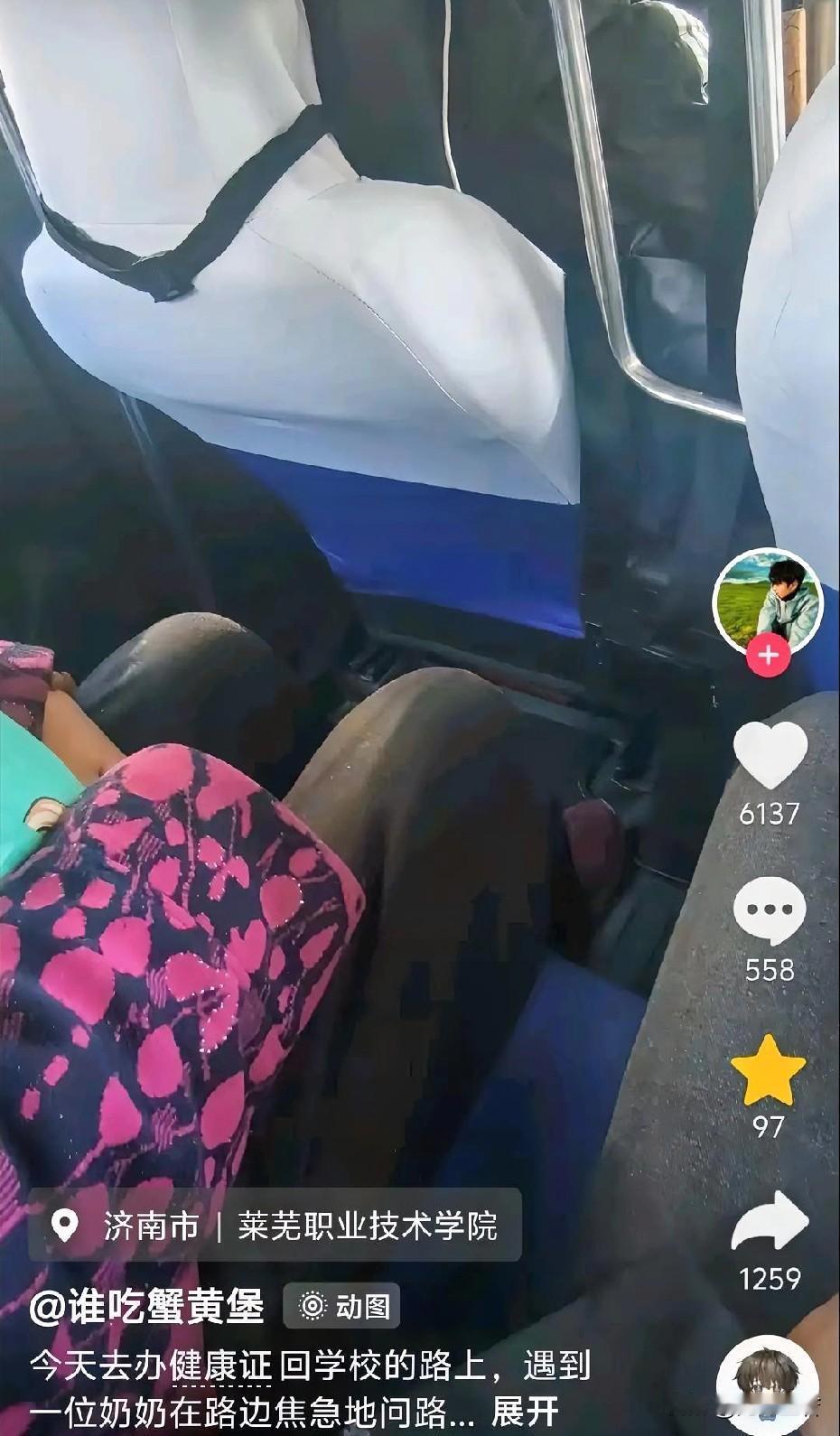 近日,山东济南,一名职校生去办健康证回校的路上,遇到一位老奶奶在路边焦急地问路。她想坐公交车回家,问了好几个人都没人理她。 小伙子是莱芜职业学院的学生,他停下来帮老奶奶查了查路线,发现最近的公交站还有一公里多。小伙子看着老奶奶蹒跚的脚步,实在不忍心让她再走那么远,就直接打了辆车送她回去。 老奶奶一路上不停地说,现在这个社会还能遇到你这么好的人。老奶奶要给小伙子钱,小伙子只要解释说他顺路,车费也才几块钱。 通过聊天得知,老奶奶的老伴得了尿毒症,大概治不好了。老奶奶这次进城,只是想找人算卦,看看能不能有什么奇迹。 下车时,老奶奶反复问小伙子的名字,还硬要塞钱给他。小伙子婉拒了,他表示,只希望她和老伴能平平安安,也希望他的家人在外遇到困难也能获得别人的帮助! 看了视频,我觉得这件事里最暖的是,这同学没光看着老奶奶着急,是真的停下脚步帮了忙,还怕老奶奶走不动直接打车送回去,这比嘴上说“真可怜”要实在太多了。 还有就是老奶奶想给老伴找奇迹的心思,听着有点让人心酸,但也能感觉到她对老伴的那份牵挂,遇到愿意帮自己的人,她反复想知道名字、塞钱,也是想把这份善意记下来,这份真心特别打动人。 最后小伙子说“希望家人在外遇到困难也能被帮助”,其实还多善意都是这样,你给别人一束光,心里也会暖呼呼的,还会悄悄种下一份对世界的期待,这种善意是会慢慢传递开的。(来源:谁吃蟹黄堡)