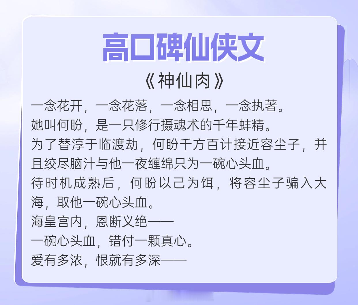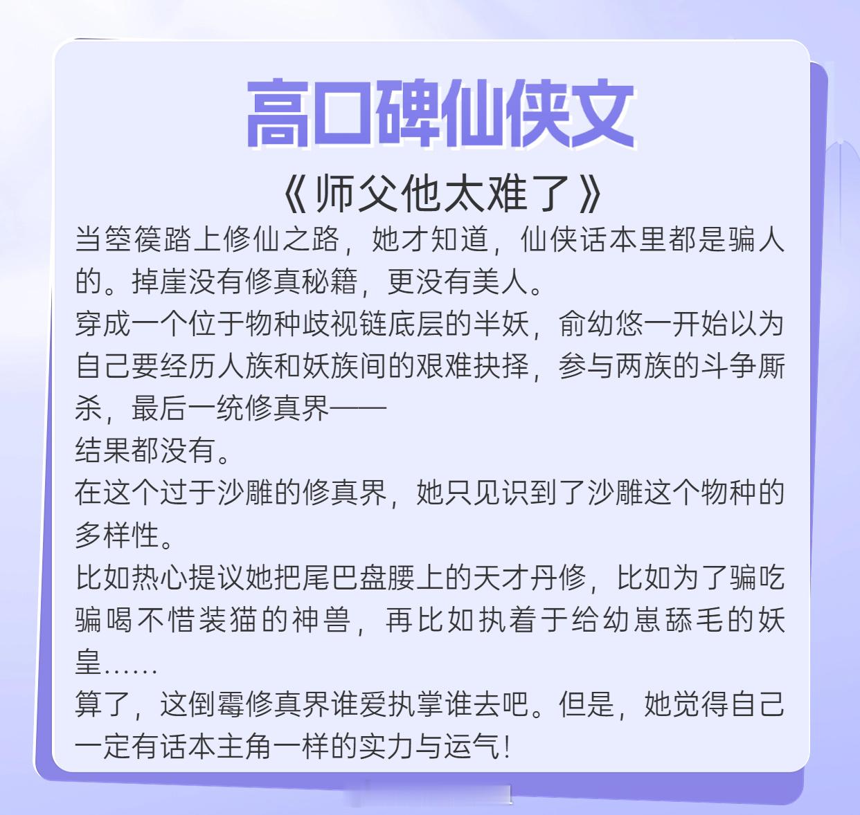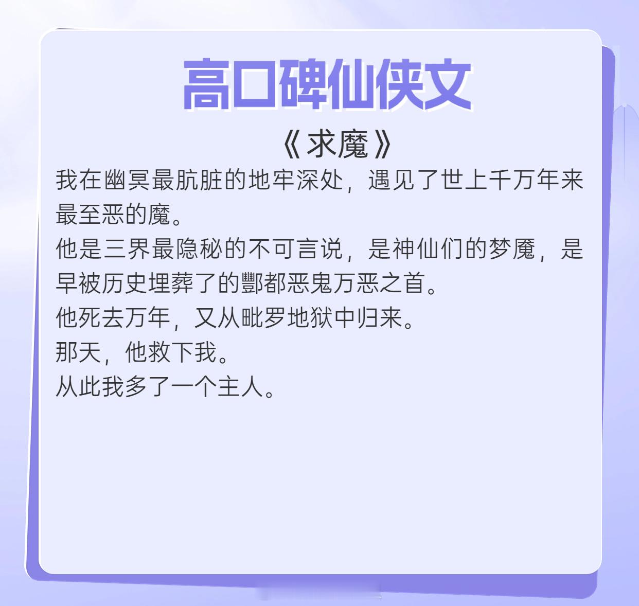 【高口碑仙侠文】有甜到齁心,有虐到肝疼,书荒必备!都是经典网文,不要错过!1、《裂山海》作者:流水2、《此间·燃灯生莲》作者:江雪落3、《勿扰飞升》作者:月下蝶影4、《修真界禁止物种歧视》作者:暮沉霜5、《师父他太难了》作者:扶华6、《求魔》作者:曲小蛐7、《与天同兽》作者:雾矢翊8、《自欢》作者:袖侧9、《神仙肉》作者:一度君华
