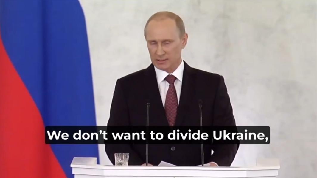 普京2014年“克里米亚止步”承诺 2014年,普京坚称俄罗斯仅限于克里米亚,不要相信其他地方会跟进的说法,俄罗斯不需要那样。 我们不希望乌克兰分裂,不需要那样。最重要的是,希望乌克兰实现和平与和谐,并与其他国家提供援助支持。