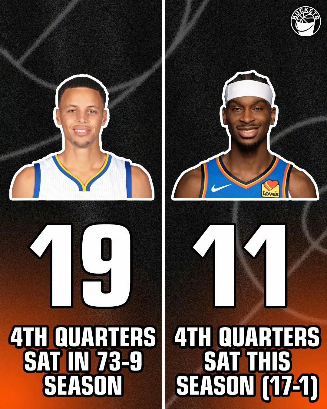 这个对比很有意思,说明雷霆王朝来了! 目前雷霆17胜1负,亚历山大有11场比赛三节打卡下班。 当年勇士王朝73胜,库里总共有19场三节打卡下班。 我还记得十年前的盛况,都在说库里真轻松,三节比赛结束就下班了。 现在雷霆真王朝了,亚历山大好轻松,主要是队友都年轻,又非常强大。 我预计雷霆能74胜8负,史上最牛![大金牙]