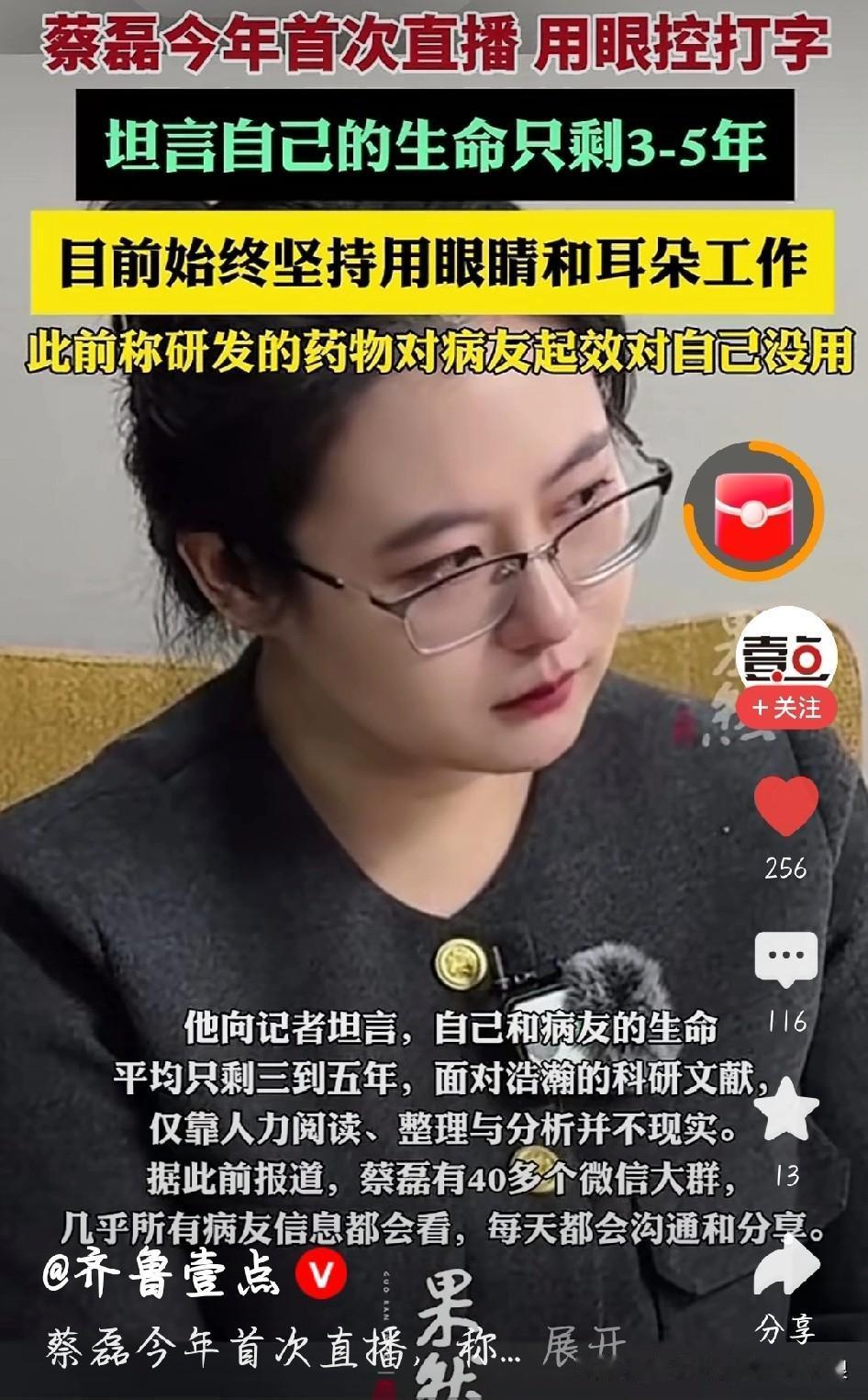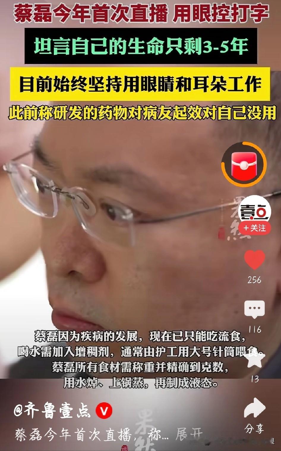 刷到蔡磊的直播,心里又敬佩又心疼!他说自己只剩3到5年生命,现在全身都动不了,只能靠眼球控制电脑,连吃饭都得是流食,用针管一点点喂。 可就算这样,他没闲着!确诊渐冻症6年,他砸钱搞科研,建病友平台,用AI加速找药,已经帮不少病友看到希望。自己研发的药对别人有用,对他没效果,他还说“特别开心”,这格局真的绝了。 他说“宁可战死,不屈辱等死”,每天从早忙到晚,就想为更多渐冻症患者拼一条生路。不是每个人都能在绝境里想着别人,蔡磊用行动告诉大家,生命的力量不在于长短,而在于重量。 真心希望奇迹能降临在他身上,也为这位和命运硬刚的斗士加油!蔡磊称自己只剩3到5年生命 渐冻症 渐冻人蔡磊称已在准备身后事 蔡磊 图片截图于网络