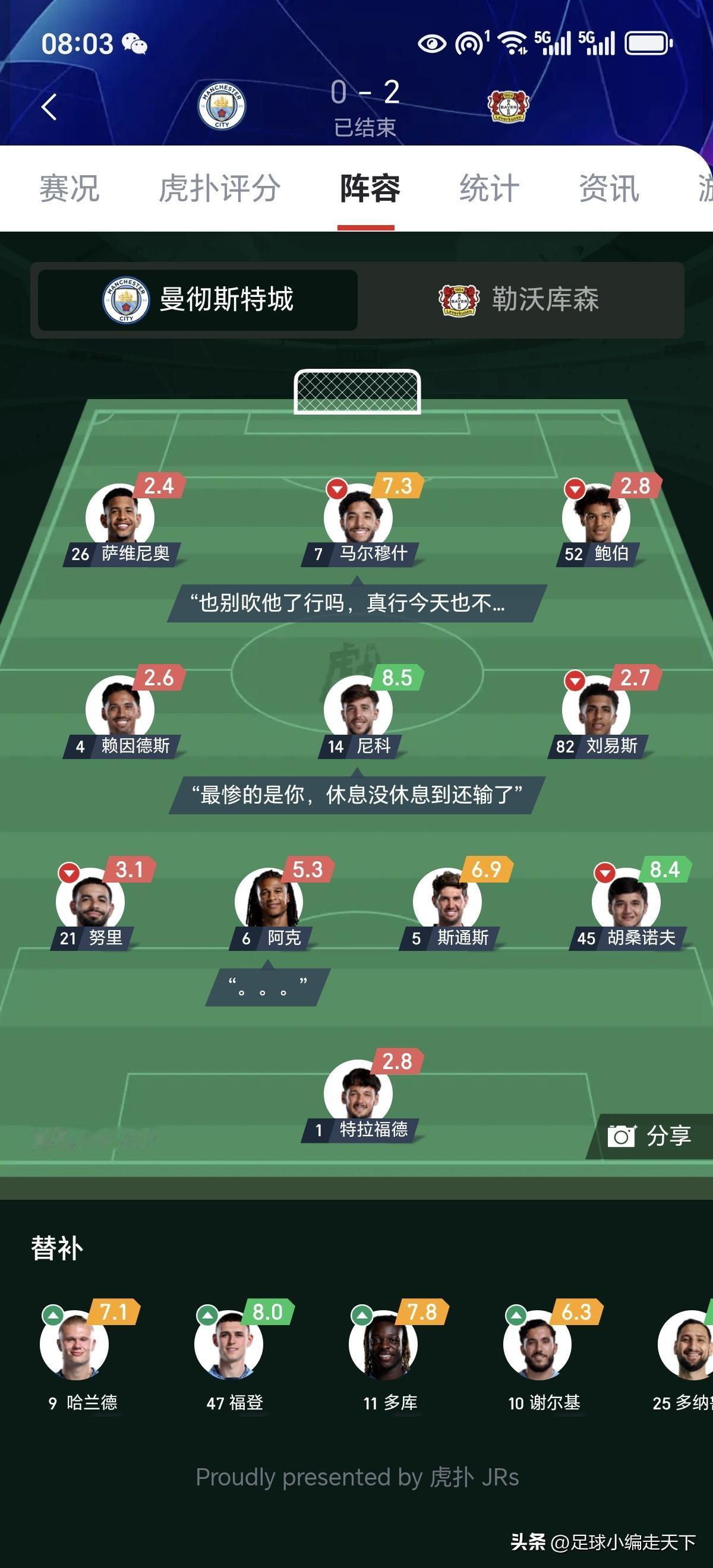 瓜瓜还是喜欢整活儿呀!为了保英超欧冠居然上全替补,这是多看不起药厂啊?首发换这么多人我也是佩服,完全没配合没磨合。 我就不明白了,下一轮英超对手是利兹联,需要这样保?再说今年你曼城想拿英超冠军也没戏啊。 我估计瓜迪奥拉是看到孔帕尼在拜仁用了轮换阵容踢了勒沃库森3-0。所以他作为师傅肯定换的要比徒弟多。 不过人家孔帕尼也就换了4个主力,而瓜迪奥拉换换了将近10个主力。这也太不把药厂放眼里了吧。 再说了你轮换干嘛把门将都换了?门将体力有问题嘛?