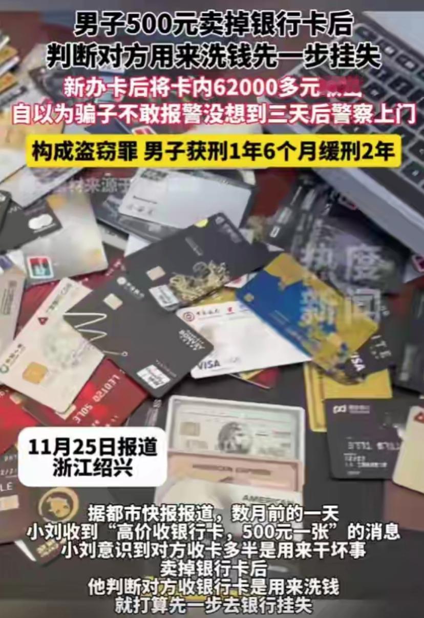 贪小便宜吃大亏!浙江绍兴,一男子看到有人收银行卡,就以500元的价格把自己银行卡给了对方,可他并非无知,而且知道对方可能要用来洗钱,于是想着“黑吃黑”,自己把钱取出来,料定对方不敢报警,结果三天后就被警方找上门了 赵某刷手机时看到一条收银行卡的信息,一张卡给五百。他心里打了个小算盘,觉得反正自己那张卡吃灰很久,放着也是放着,就把卡和身份证复印件全给了对方。手里多了五百块,他当时心情特别美,觉得这波稳赚 等到他冷静下来,回味细节时才发现事情有点不对劲。对方收卡的时候态度很不自然,还不停追问能不能大额转账、挂失麻烦不麻烦 赵某突然心里一紧,意识到这卡大概率要被拿去做见不得人的事。正常反应应该是立刻去报警,结果他脑子里闪出的却是另外一个念头,觉得既然对方打算干坏事,那肯定不敢闹事,不敢报警,那他是不是还能反手占一波便宜 于是他跑去银行挂失,说卡丢了。等新卡到手,他查余额整个人愣住,卡里多了六万多。他一边取钱,一边还觉得自己特别聪明,觉得对方哑巴吃黄连,敢怒不敢言 他这一套操作看着像占便宜,实际是把自己送到火坑里。因为这笔钱不是天上掉的,是涉案资金,一旦他取了,就是在占别人的财物。更关键的是,那些利用别人银行卡搞事的人不报警,不代表警方不知道 三天后警察上门,把赵某带走。他还没反应过来,事情就已经落了定性。法院认定他非法占有,他人财物,金额还不小,属于盗窃,最后判了一年六个月,缓刑两年 显然赵某的小聪明没有用到地方,有些人觉得别人违法,那我坑一下又能怎样,反正他不敢说。可现实里,真正的风险从来不是来自那些搞事的人,而是来自系统和法律 一张银行卡,背后连着的是一个人的身份信息,也是银行的监管链路。一旦交出去,等于把自己放到别人手里。你不能预设别人不报警,也不能预设执法部门不会查到你。吃亏的永远是最先伸手的人