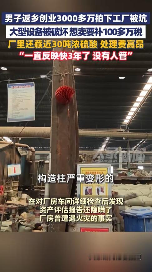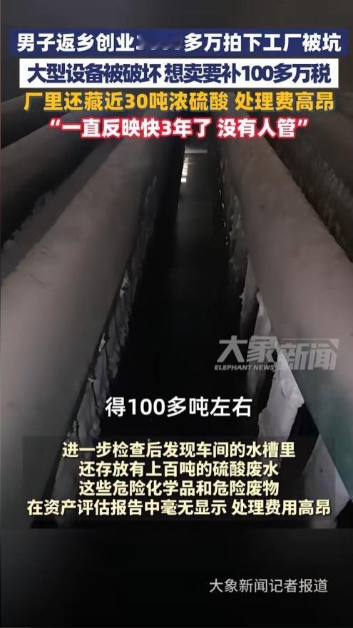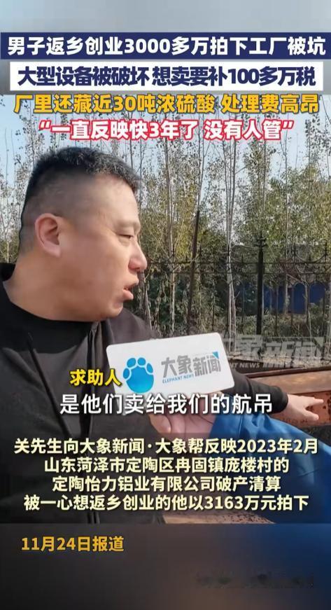 “这不是坑人嘛!”山东菏泽,男子返乡创业,花3000多万拍下了一家工厂,本想着接手后好好发展一下,结果付了钱却发现都是问题,评估报告显示设备都是好的,可走近一看才发现都成了废铁,工厂里还藏了20吨浓硫酸,处理费用那是相当高 据大象新闻11月24日报道,关先生在外打拼多年,事业小有成就,心里总惦记着为家乡做点贡献。 2023年2月,他看到了当地一家名为“定陶怡力铝业”的公司正在进行破产清算拍卖,这让他眼前一亮,官方出具的评估报告写得非常漂亮,厂房、设备、土地加起来,总价值评估超过4100万元。 看着这份报告,关先生觉得这是个千载难逢的好机会,他仿佛已经看到了工厂在自己手中焕发生机,带动家乡经济发展的蓝图。 为了拿下这个项目,他毫不犹豫地缴纳了300万元的保证金,并最终以3163万元的价格成功竞拍,当他付清全款的那一刻,心里充满了期待。 然而,他万万没有想到,这场看似公开透明的拍卖,从一开始就充满了蹊跷,在竞拍之前,关先生本想进厂区实地看看情况,这本是再正常不过的要求,却被当时的租户强硬地拦在了门外。 他只能像个局外人一样,扒着大门的缝隙,远远地眺望,根本看不清里面的真实状况,更离谱的是,就连最后办理交接手续,都是在工厂大门外草草完成的。 这种被推着走的感觉,让他心里有些不安,但想着有评估报告兜底,应该不会出什么大问题,可当他终于拿到钥匙,第一次以主人的身份踏入工厂时,眼前的景象让他从头凉到了脚。 所谓的“设备齐全”,完全就是个笑话,评估报告上白纸黑字写着的喷涂生产线,关键零件不翼而飞,根本无法启动。 一台螺杆冷水机,打开一看,里面空空如也,别说制冷了,有网友开玩笑说“这都能在里面养鸽子了”。 厂房里的航吊,不仅多年没有年检,机身还有明显的切割痕迹,上面的检测标志显示,早已过期十年。 更让关先生气愤的是,评估报告上明确标注的一些设备,竟然凭空消失了,如果说设备问题只是让人恼火,那接下来的发现,就足以让人心惊胆战。 在一个锈迹斑斑、已经标明“报废”的大罐子里,竟然存放着整整20吨的浓硫酸!这可是极度危险的化学品,稍有不慎就可能引发重大安全事故,而在车间的水槽里,还积存着几百吨的硫酸废液。 这些致命的隐患,在长达几十页的评估报告中,竟然一个字都没有提到,这就像在关先生身边埋下了一颗定时炸弹,随时都可能引爆。 有懂行的人说,处理这些危险化学品,费用可能高达几百万元,这笔钱,又得关先生自己掏,一波未平一波又起,关先生还发现,厂房的钢结构车间曾经发生过火灾,好几根主要的承重构造柱已经被烧得弯曲变形,整个厂房的结构安全存在巨大问题。 找专业人士来评估,得出的结论是,修复的成本甚至比推倒重建还要高,这下好了,花三千多万买来的不只是废铜烂铁,还有一个根本不能用的危房。 更让人哭笑不得的是,税务部门找上门来,告诉他,虽然这些设备都已经是废品,但在账面上,他的公司还需要为这些“资产”补缴100多万元的税费。 这简直是天大的讽刺,花钱买了一堆垃圾,不仅不能产生任何价值,还得再倒贴一大笔钱去处理和交税,关先生的返乡创业梦,还没开始,就已经碎得一塌糊涂。 关先生不是坐以待毙的人,他开始了自己的维权之路,他首先找到了负责这次拍卖的破产管理人,希望能给个说法,但对方却玩起了“躲猫猫”,避而不见。 无奈之下,他向法院求助,得到的回复却让他感到更加无力,法院方面表示,这次拍卖是破产管理人自主进行的操作,不属于司法拍卖,与法院没有直接关系。 这个说法让关先生无法接受,难道花了三千多万,就这么不明不白地打了水漂?有律师指出,破产管理人的所有行为都应该在法院的监督之下进行。 现在出了这么大的问题,评估报告与实际情况天差地别,这其中涉及的不仅仅是评估公司的失职,更是监管环节的严重缺失。 随着事情的发酵,出具那份“完美”评估报告的中惠土地房地产资产评估公司也被查出存在数据计算错误、档案管理混乱等诸多问题,被责令整改。 但对于关先生来说,一句“整改”又有什么用呢?他实实在在损失的三千多万,还有那些额外的处理费用,谁来承担?赔偿机制又在哪里? 这些关键问题,至今没有人能给他一个明确的答复,这件事在网上传开后,引起了无数人的共鸣。 很多网友都表示愤慨:“这不是欺负老实人吗?满怀希望回家乡投资,结果被自己人坑了,太寒心了!” “评估报告形同虚设,监管部门视而不见,这水也太深了!” 的确,关先生的遭遇,戳痛了无数怀揣返乡创业梦想的人的心,他们最怕的不是创业的艰难,不是市场的风险,而是这种来自规则和程序内部的“陷阱”。 关先生的维权之路还在继续,我们希望他能讨回公道,更希望这件事能敲响警钟,让类似的“陷阱”不再出现,别再让创业者的热血,凉在回家的路上。 信源:大象新闻2025-11-24