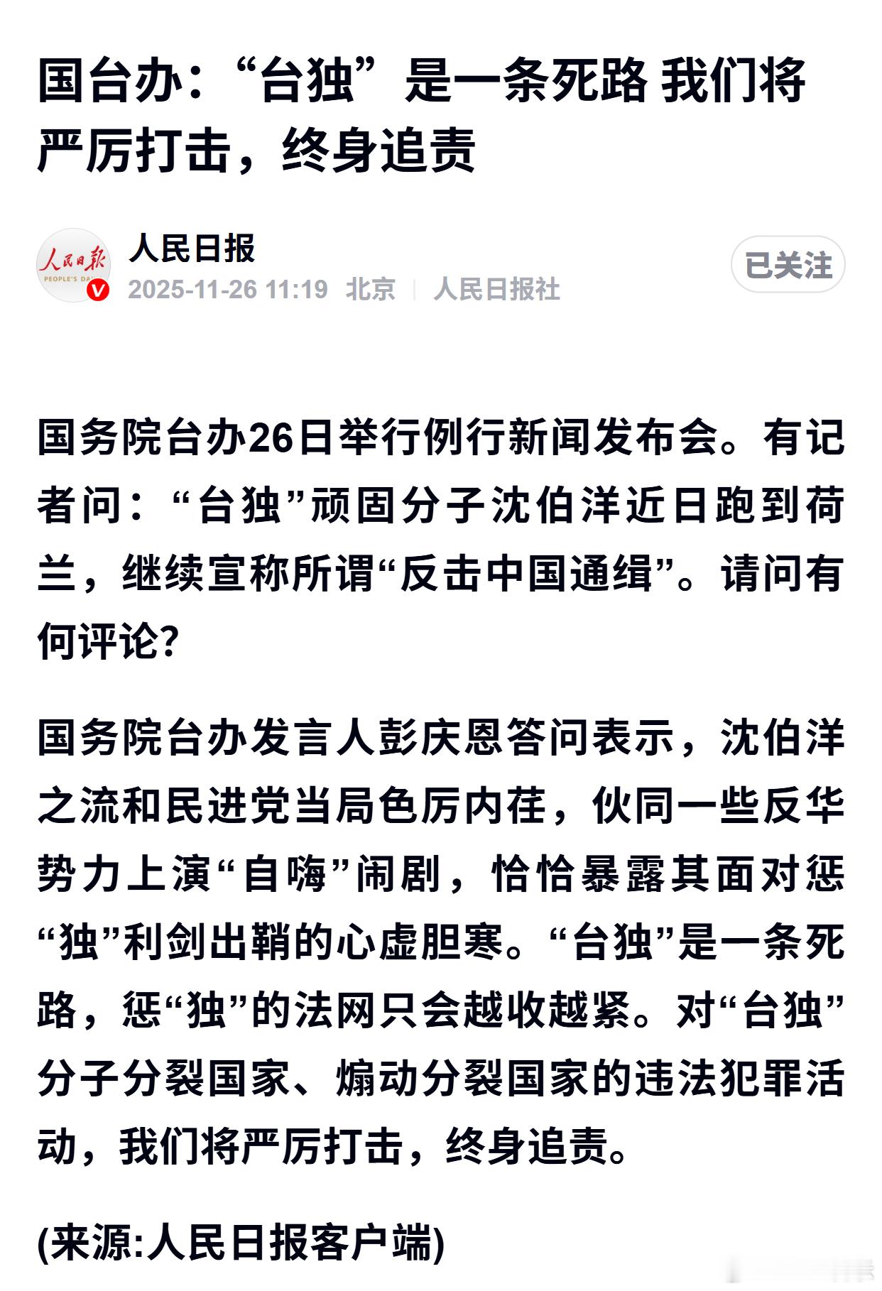 国台办:“台独”是一条死路我们将严厉打击,终身追责