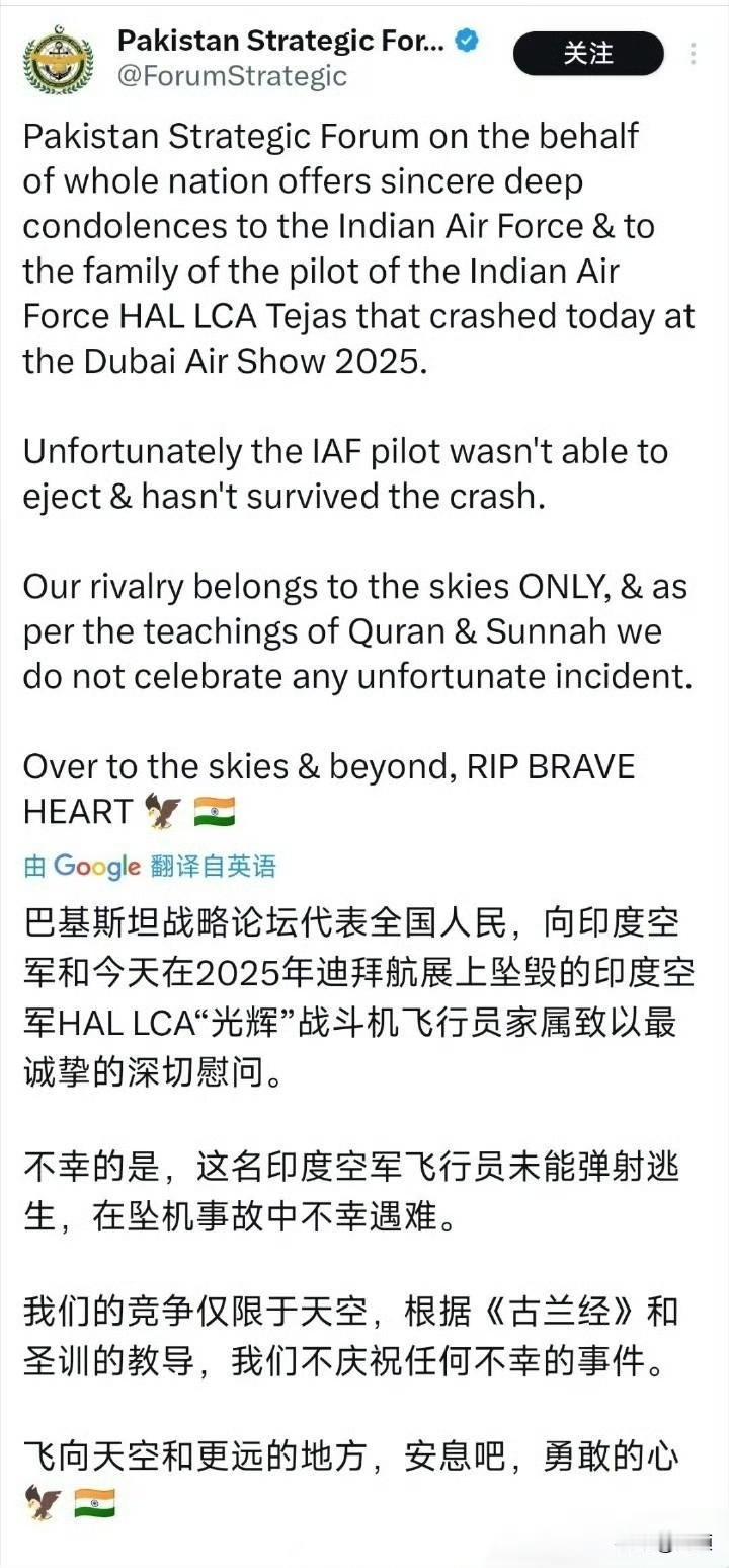 巴基斯坦防长哀悼印坠毁战机飞行员…称与印度的竞争仅限于天空,不庆祝任何不幸的事件。 最后祝愿印度飞行员安息,飞向天空和更远的地方… 不得不说这哀悼文采斐然、情真意切,一点没有猫哭老鼠的窃喜和嘲讽