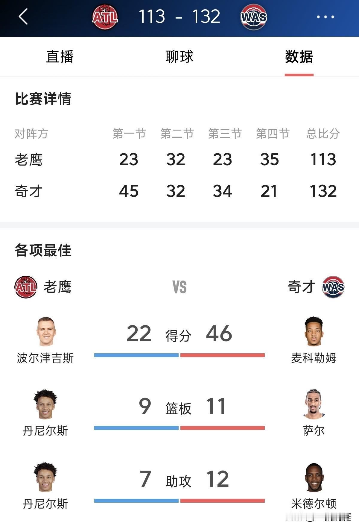奇才终于赢球了,止步于14连败!今天奇才主场大胜老鹰,迎来球队本赛季第二场胜利。这主要是麦科勒姆拿到了46分,本赛季他场均16.5分是生涯第三低,只比进联盟时第一二赛季多,目前总得分有15684分,同届的字母哥早已经超过两万分了。