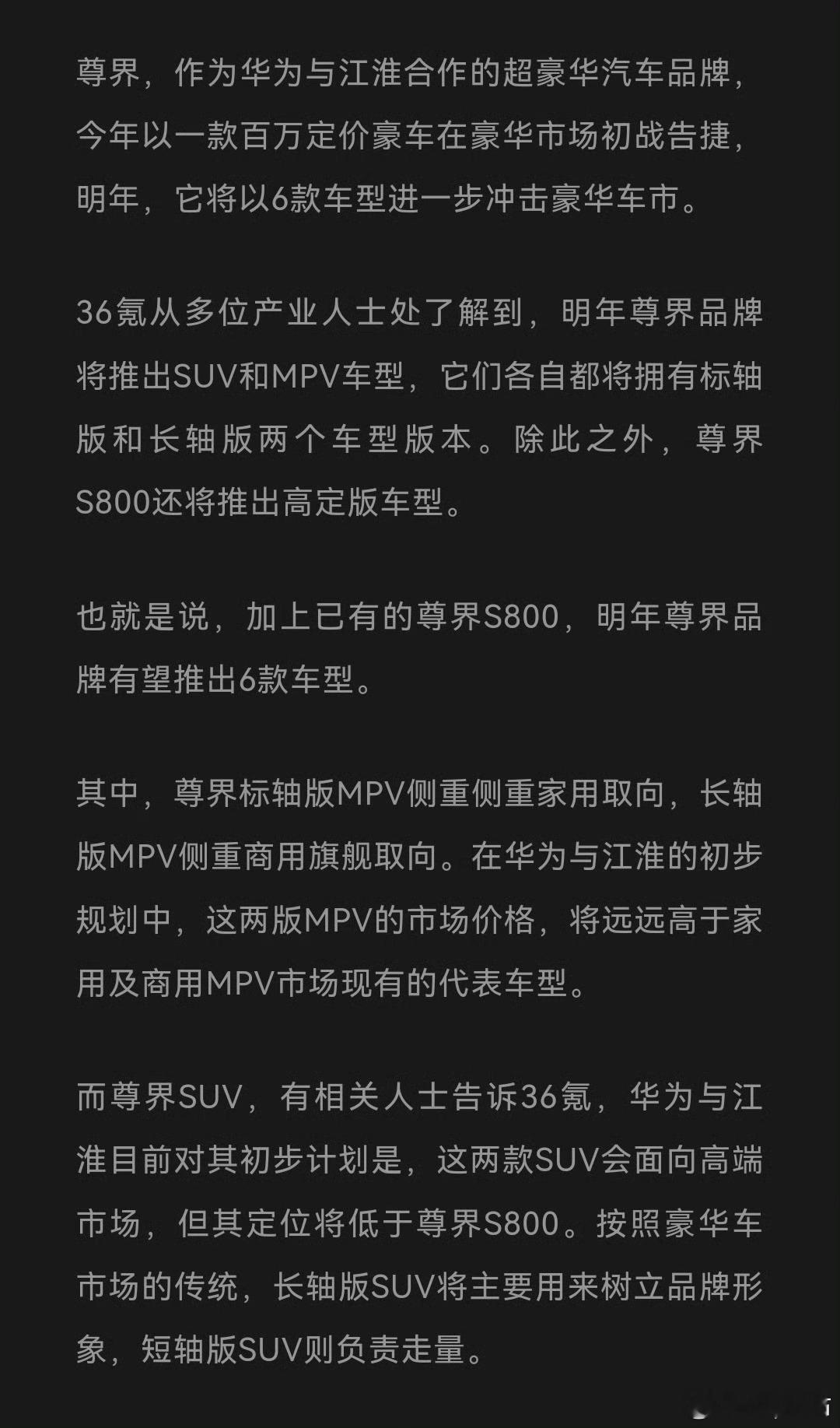 这……没有这么多压根就没有那么多人能聚焦这么多产品做车不需要实车验证和工艺质量爬坡了吗?以尊界的产品力和调调一个种类车型能够做好就足够了把节奏打稳,做好车辆从宣发到交付节奏全流程的把控,这才是尊界应该做的事情所以明年把MPV和现有S800做好就足够了鸿蒙智行尊界s800