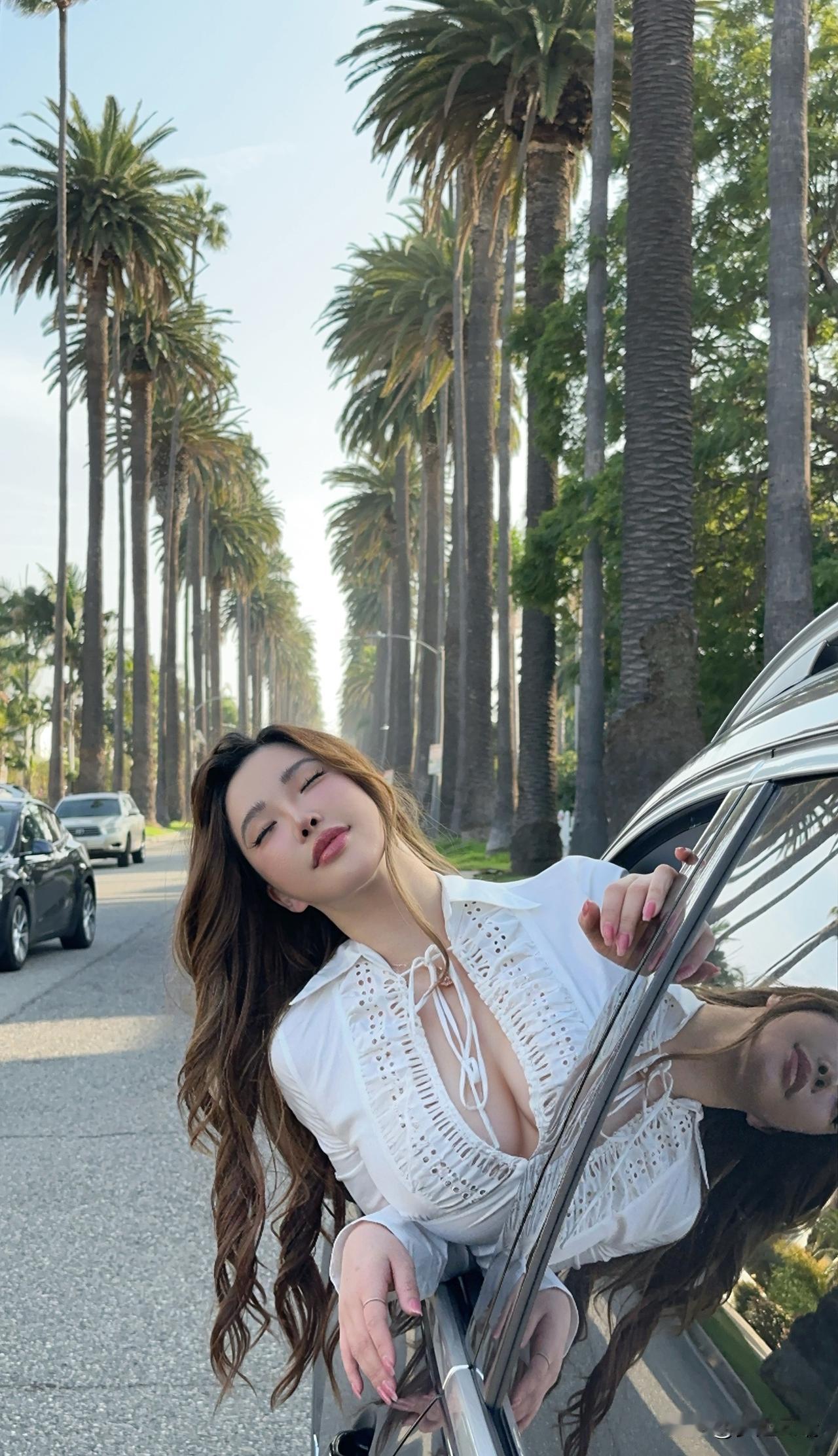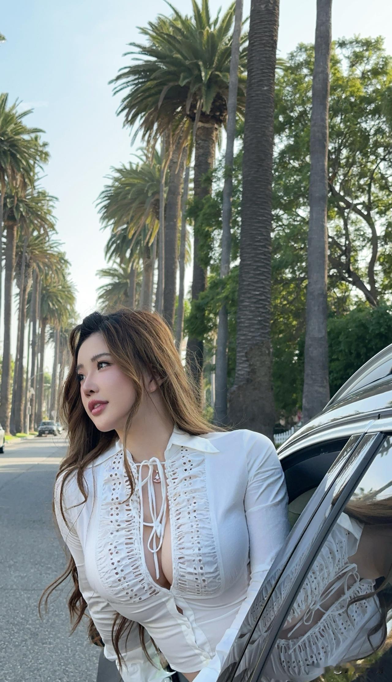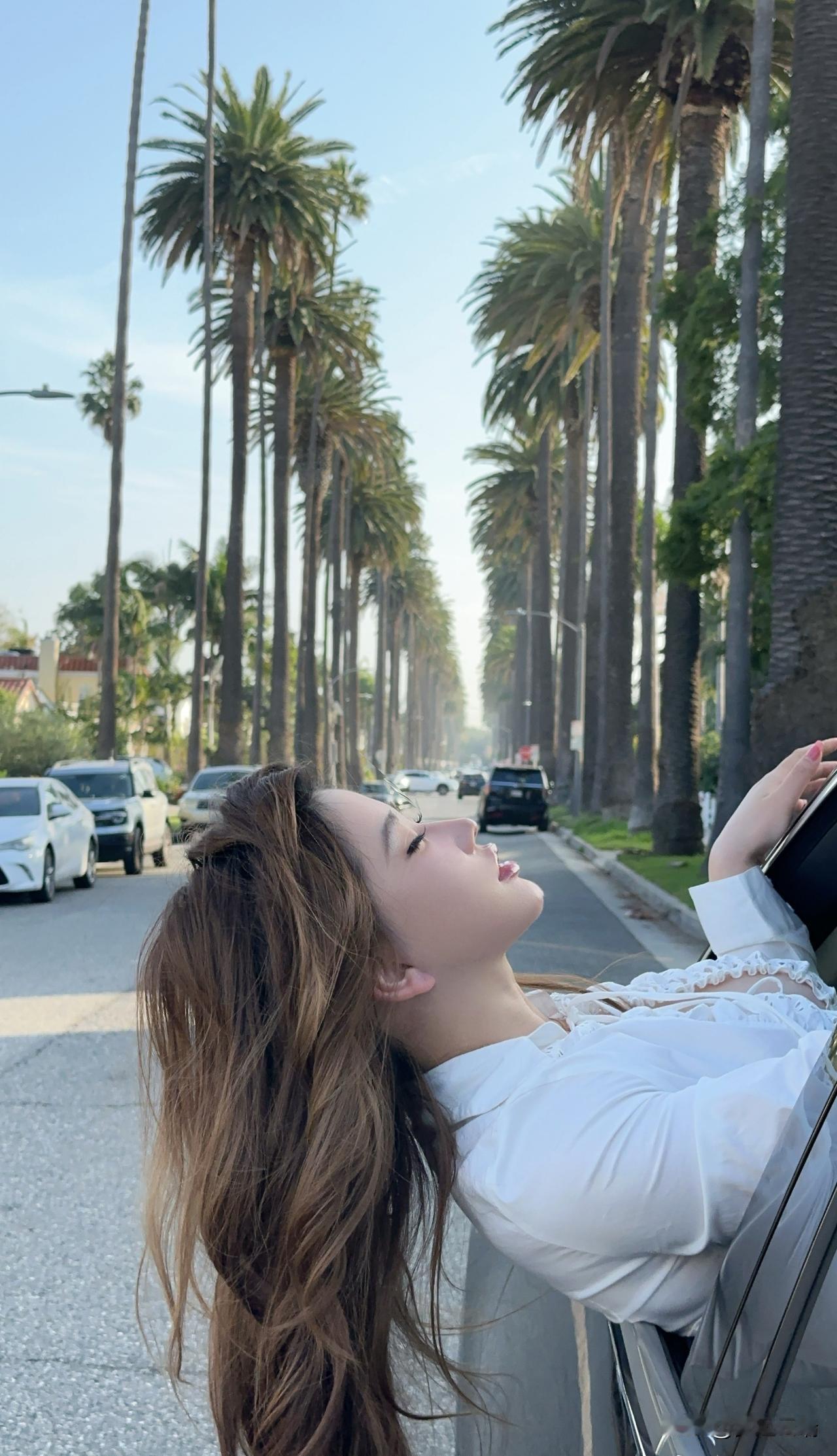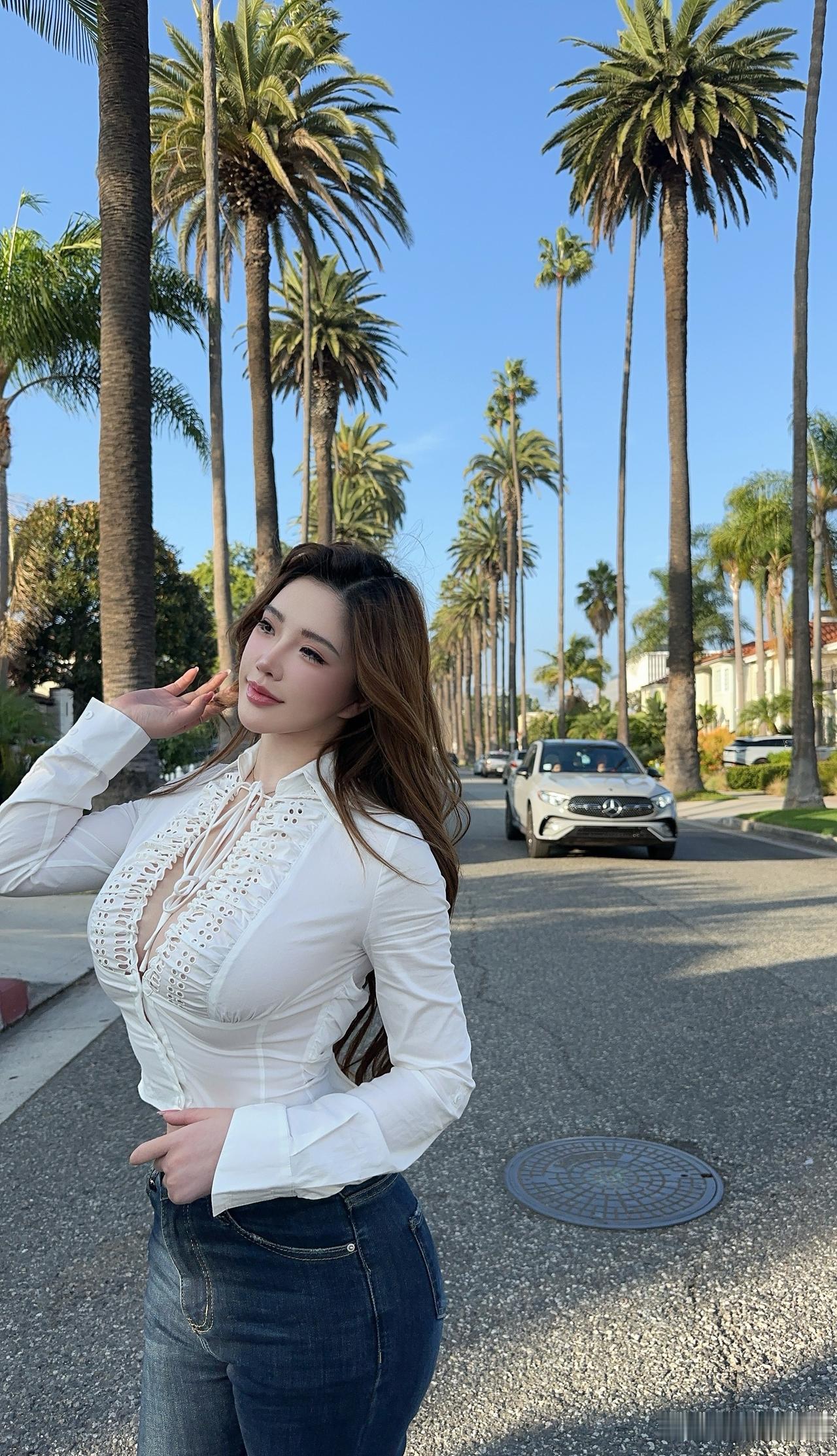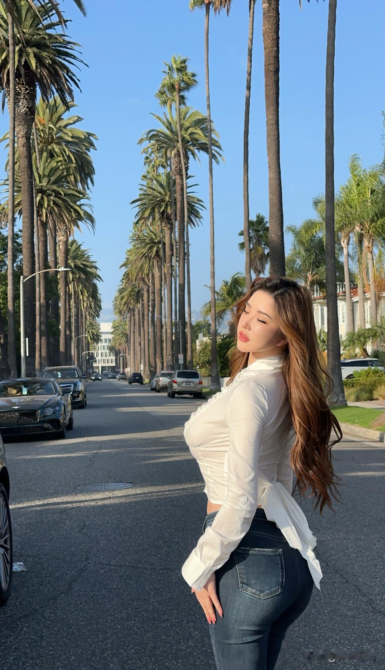 阳光明媚的街道上,时尚女孩与棕榈树相伴,尽显都市风情。