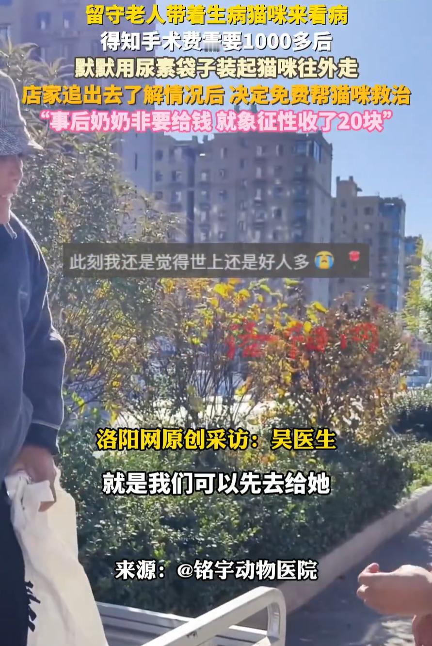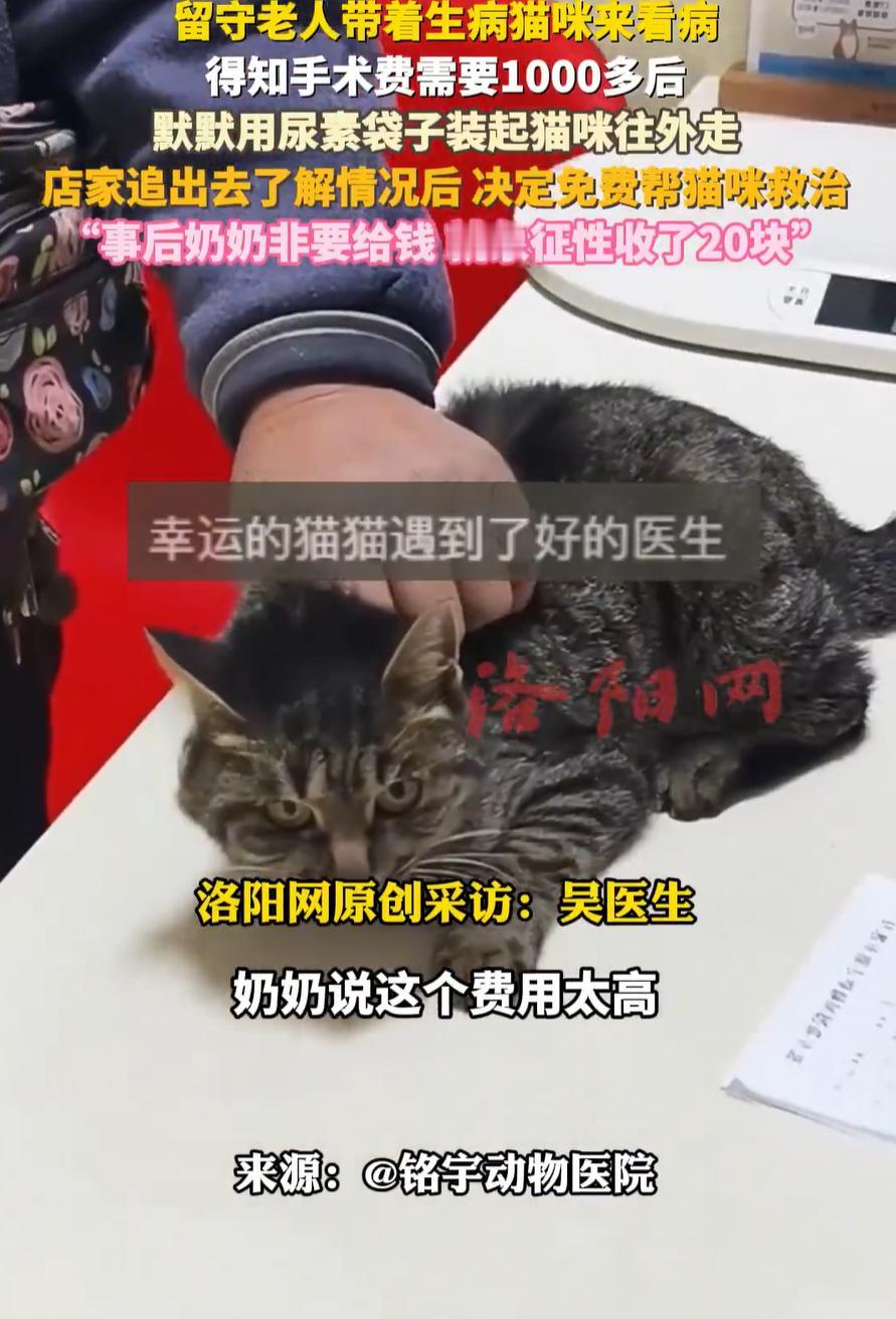 泪目!河北石家庄,一位留守老人拎着尿素袋走进一家宠物医院,随后从袋里抱出一只小猫,说哪怕少吃两口饭也要给小猫看病,可当他听到手术费要1000块时,又默默带着小猫离开了,宠物医院于心不忍,追出去把大妈叫了回来,表示费用他们来承担 吴医生介绍,当天老人抓着一个尿素袋子进入宠物医院,工作人员还以为是来收废品的,可老人却从袋子里抓出一只小猫,说它生病了,不吃东西,还一直在吐,希望宠物医院能给治一治,看看花多少钱 检查后发现,小猫有明显肠道异物的问题,只能做手术,费用大概是1000块,再加上后期治疗,可能要2000块 结果大妈听到价格后,表情有些落寞,默默把小猫放回袋子里,还跟小猫念叨着:不给它治了,回家吧,这就是你的命 看到老人的样子,吴医生也是于心不忍,追出去跟老人说可以帮忙治疗,开始老人还担心费用的问题,后来说免费治疗,老人这才放心 经过手术,小猫恢复了正常,但老人却坚持要给钱,最终宠物医院只是象征性收了20块钱 这个事被传到网上后,不少网友都被感动到 有人说,老人自己可能过得并不宽裕,却还想尽力去救一只小猫 也有人说,宠物医院这一追,不只是救了一条命,也暖了一颗心 其实,这不是什么大事,却格外触动我们。那只小猫,也许是老人独自生活中的一点陪伴。她拎着尿素袋走进宠物医院的那一刻,不是作为“爱心人士”出现的,而是一个平凡的、想尽力去保护身边一点依靠的老人 我们常说善良是互换的,其实很多时候是接力的。老人愿意为小猫少吃两口饭,医生愿意为老人免掉费用,下一次看到别人有难,说不定我们也会下意识多迈一步