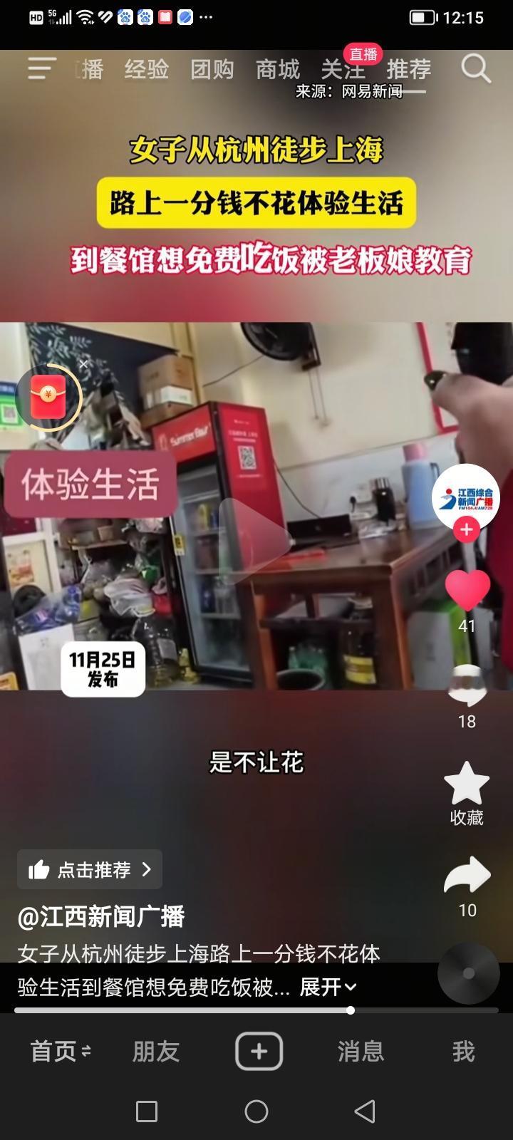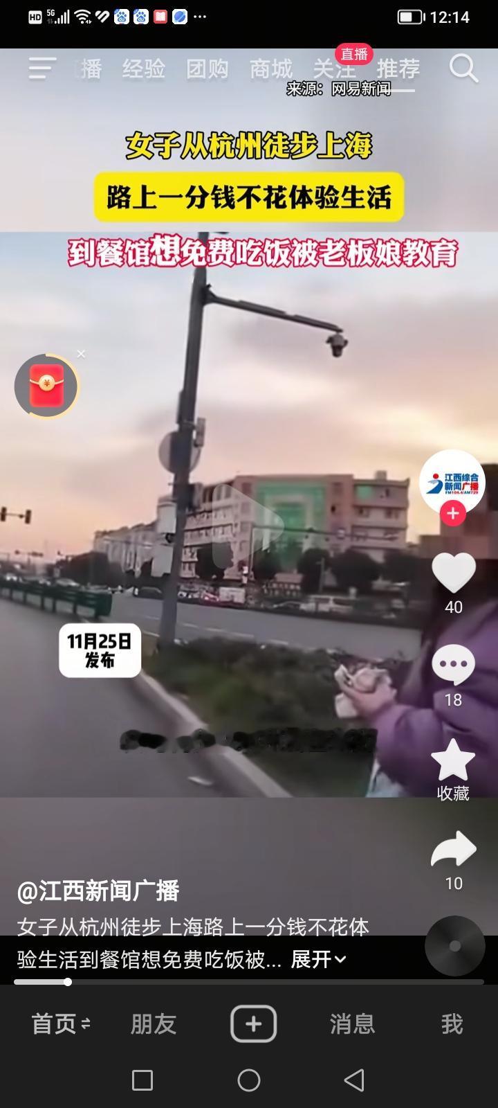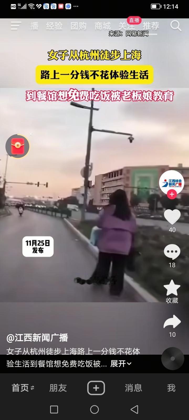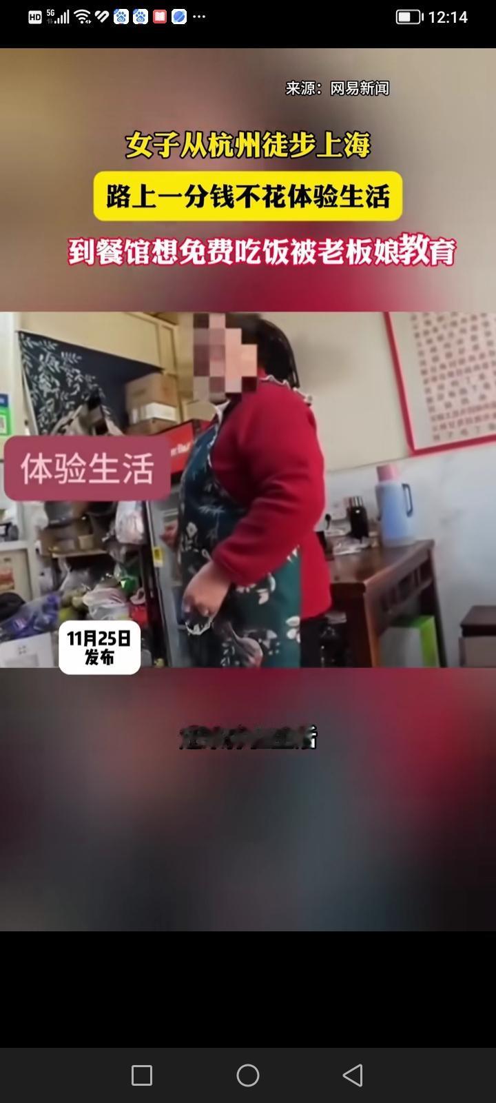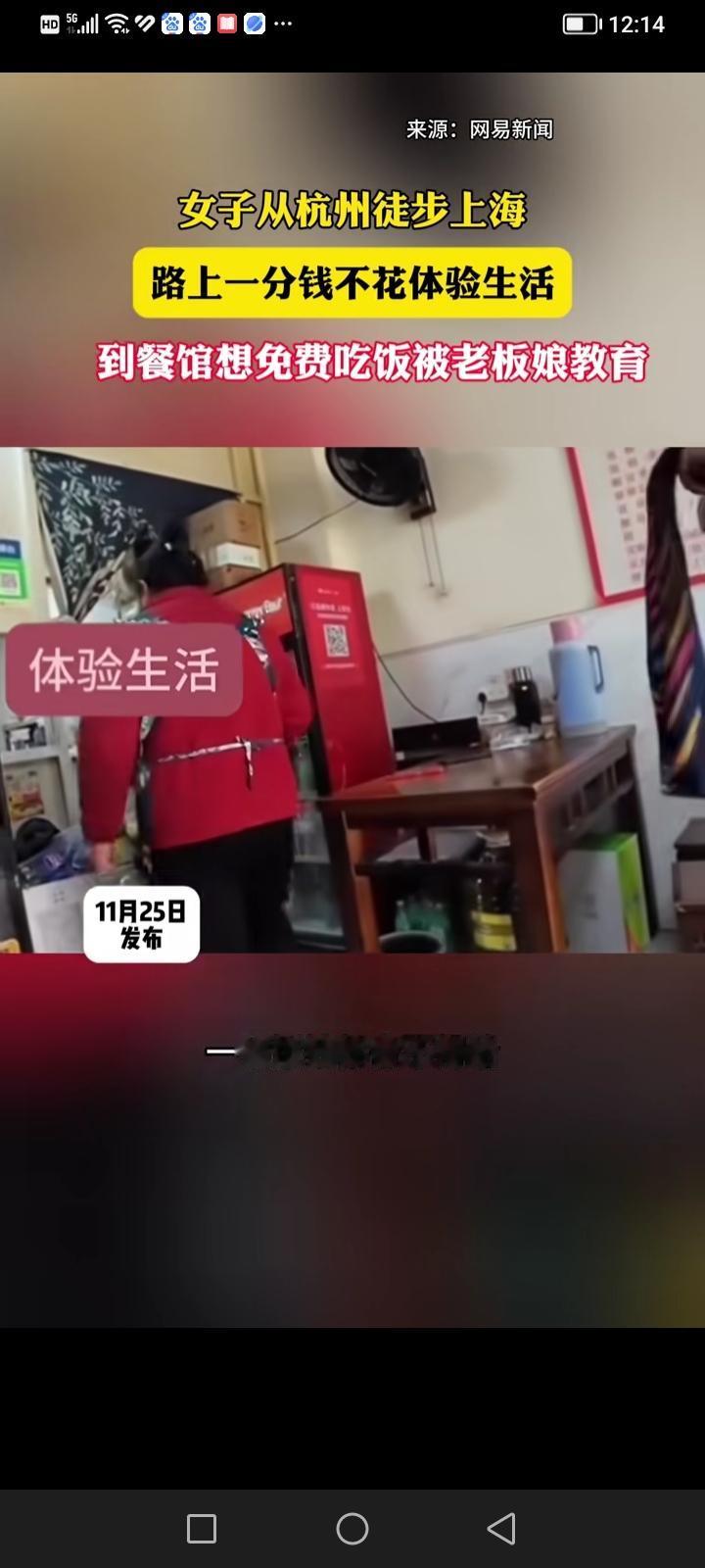 一女子囗中说体验生活,其实就是想白嫖别人。11月25日,一女子称要一分钱不花从杭州徒步到上海来体验生活,她先向一位路人求助被果断拒绝,之后又走进一家饭馆,希望老板娘能提供一顿免费的饭 。 老板娘得知缘由后直接拒绝了她,还直言“你们有钱人还体验生活,吃顿饭一分钱都不想花”,并强调店家只帮助真正有困难的人,不会帮这种单纯体验生活的人。女子辩解这不是舍不得花钱,而是一堂体验课,但最终还是尴尬地离开了饭馆 。支持老板娘的做法,女子若想获得食物,完全可以用洗碗等劳动来换取,而非直接索要免费餐食。善心不应该被辜负,但也不能增长一些想不劳而获的人。一位网友说的好:“有困难了可以帮助。你没有困难,还体验吃霸王餐,所有人都学你体验免费吃喝,那老板一天白干不说,还成本费和房租物业费都得自己给”。(图片信息来源:江西新闻广播)上海白嫖事件 网络白嫖族 白嫖经济 旅游白嫖 网络消费行为 精神白嫖 遇到吃“霸王餐”的顾客该怎么办?