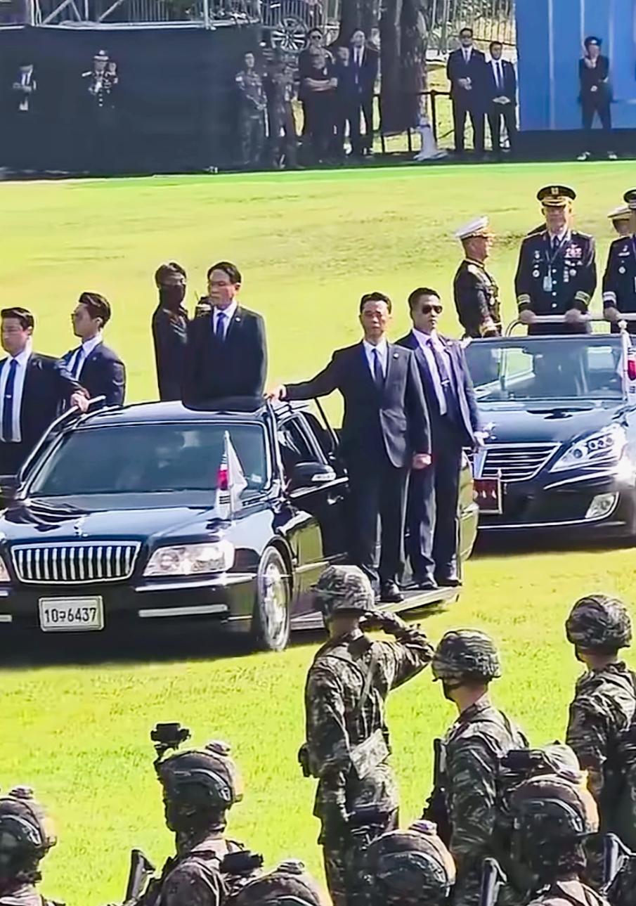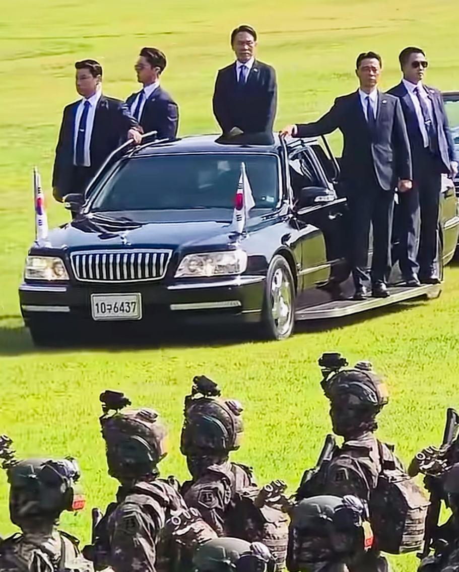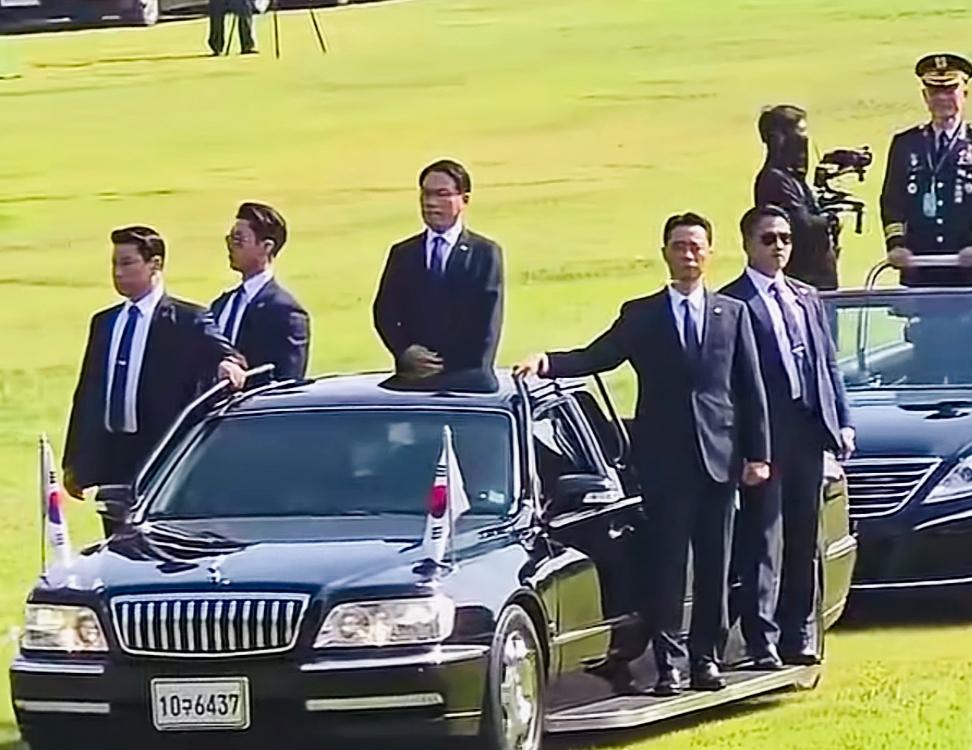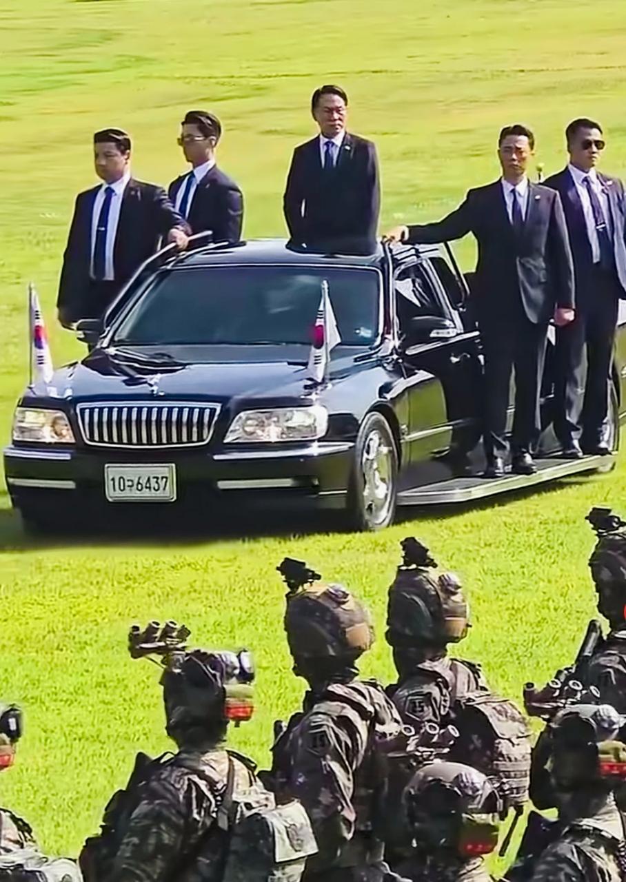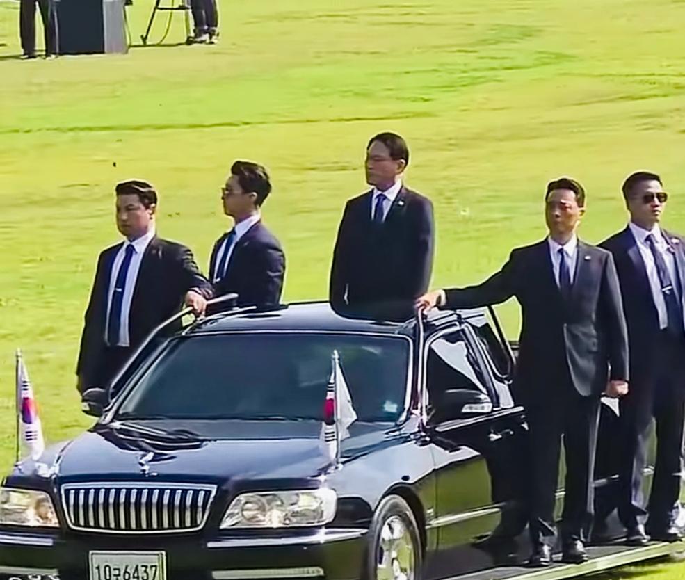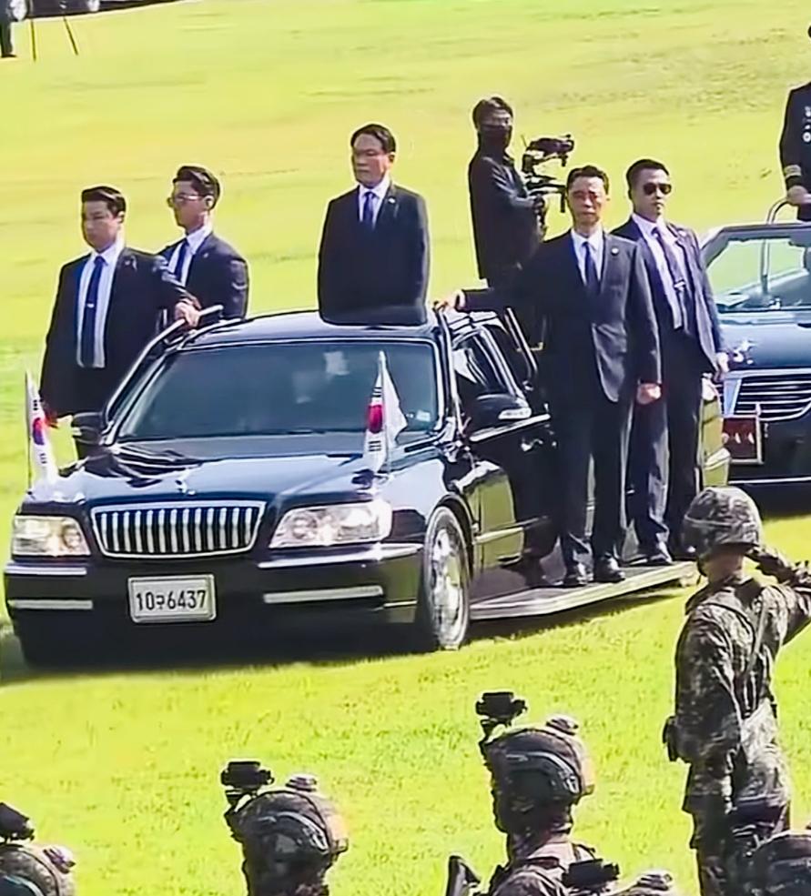 韩国检阅用车挺有意思啊! 站在车两边的四位,是不是个个都身手不凡啊! 戴墨镜🕶️的两位,是不是警觉性特别高啊!