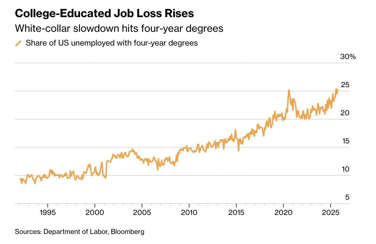 在所有失业人群中,4年制大学学历的人占比超过了25%;这意味着白领工作变得不再吃香....... 技术变革带来的劳动力市场的重塑,令我们不得不思考,未来的“人才”画像应该是怎样的。白领不如水管工,技校应该会是个好出路