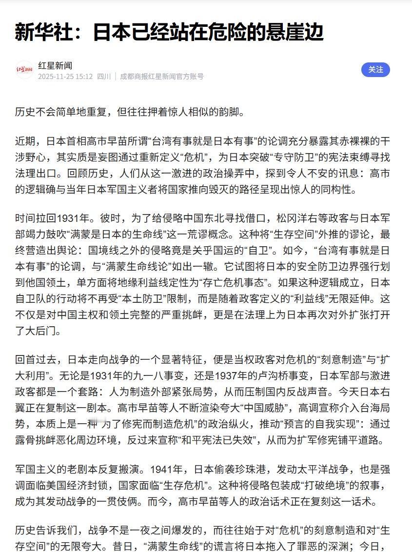 11月25日,新华社宣布:日本已经站在危险的悬崖边
