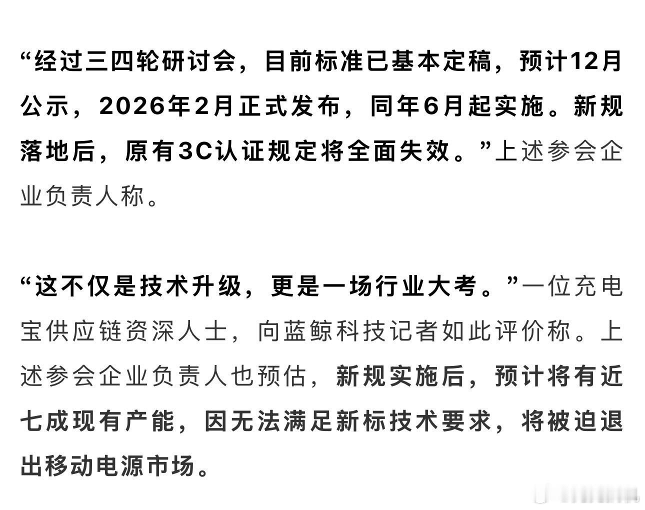 充电宝3C认证将全面失效省流版: 新规定将于12月公布,明年2月份发布同年六月份实施,届时此前3C认证的将全面失效