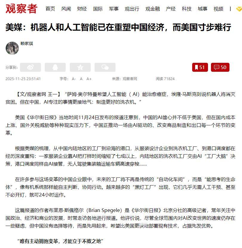 美媒:跟中国相比,在AI和机器人产业方面,美国已经走到头了! 美国现在搞AI和机器人产业,不是技术不行,而是被自己的制度和成本捆住了手脚。 英伟达CEO黄仁勋都急着警告,说中国要赢下AI竞赛,核心问题就出在美国的AI监管上,联邦层面没统一规矩,50个州各自出台AI法案,光2025年就有260多项相关提案,最后变成了“50套新规”。 企业想在全国铺开业务,得逐州准备合规材料,加州要交透明报告,纽约得做歧视评估,科罗拉多还要提交偏见检测文档,合规成本一下子飙升到数千万美元,开发周期从数周拖到半年,根本没法跟中国企业抢速度。 更要命的是能源成本的差距。AI训练本来就耗电,英伟达一个GPU集群微调一次,电费堪比中型城市一周用量。 美国加州工业电价差不多0.21美元/千瓦时,而中国给数据中心搞电力补贴,电价低到0.056美元/千瓦时。 加上加州、科罗拉多这些州还要求AI项目算碳足迹,超标的要交罚款,美国企业想扩大规模,光能源和环保成本就扛不住,这也是黄仁勋最焦虑的点,美国的算力优势,慢慢变成了“纸上谈兵”。 反观中国,AI能快速重塑经济,核心是有实打实的产业基础和政策协同。世界银行数据显示,2024年中国制造业占GDP的25%,比世界平均水平高10个百分点,这么大的实体经济盘子,给AI提供了海量应用场景。 就像“十四五”期间,中国工业互联网核心产业规模突破1.5万亿元,覆盖了49个国民经济大类,建了1260家5G工厂,340多个工业互联网平台连了1亿多台设备,AI不是飘在云端的技术,而是能直接嵌入生产的“工具”。 现在中国的AI应用早就超出了工厂范畴,雄安新区的智慧农业就是典型。农业农村部官方报道里提到,当地搞了个“雄小农”AI大模型,农民拍张照片就能识别病虫害,还能预测农产品价格,连农技人员不足的问题都解决了。 温室里的人形机器人“小V”能自动采摘番茄,配合水肥管控系统,比传统温室节水60%、节肥50%,产量还翻了四倍。 这种从工业到农业的全场景渗透,靠的就是国家层面的统筹,“人工智能+”行动明确了方向,地方有具体政策支持,企业不用纠结合规问题,能专心搞落地。 还有个关键差异是发展模式。美国的AI企业大多扎堆在互联网、软件领域,而中国是“AI+实体经济”的路子。 比如宁德时代的AI储能平台、雄安的智慧农业,都是把AI用在生产、种植这些实打实的领域,既解决了实际问题,又能通过数据反馈优化技术。 中国的工业机器人保有量全球第一,不是靠单个企业发力,而是整个产业链的协同,国家有工业互联网的数字底座,企业有应用场景,甚至电力成本都有政策扶持,形成了良性循环。 其实中美差距的核心,不是谁的技术更先进,而是谁能让技术真正服务于经济。美国被碎片化的监管、高昂的能源成本拖慢了脚步,想创新却处处受限。 中国则靠统一的政策引导、庞大的实体产业基础、可控的运营成本,让AI快速落地生根。 中国的实践证明,技术变革不是孤立的,需要制度、产业、政策形成合力。 这不仅是中国制造业的升级,更给全球产业转型提了个醒:AI要想重塑经济,不能只盯着实验室里的技术,更要找到扎根实体经济的路径,平衡创新与效率、监管与发展,这才是未来的核心竞争力。
