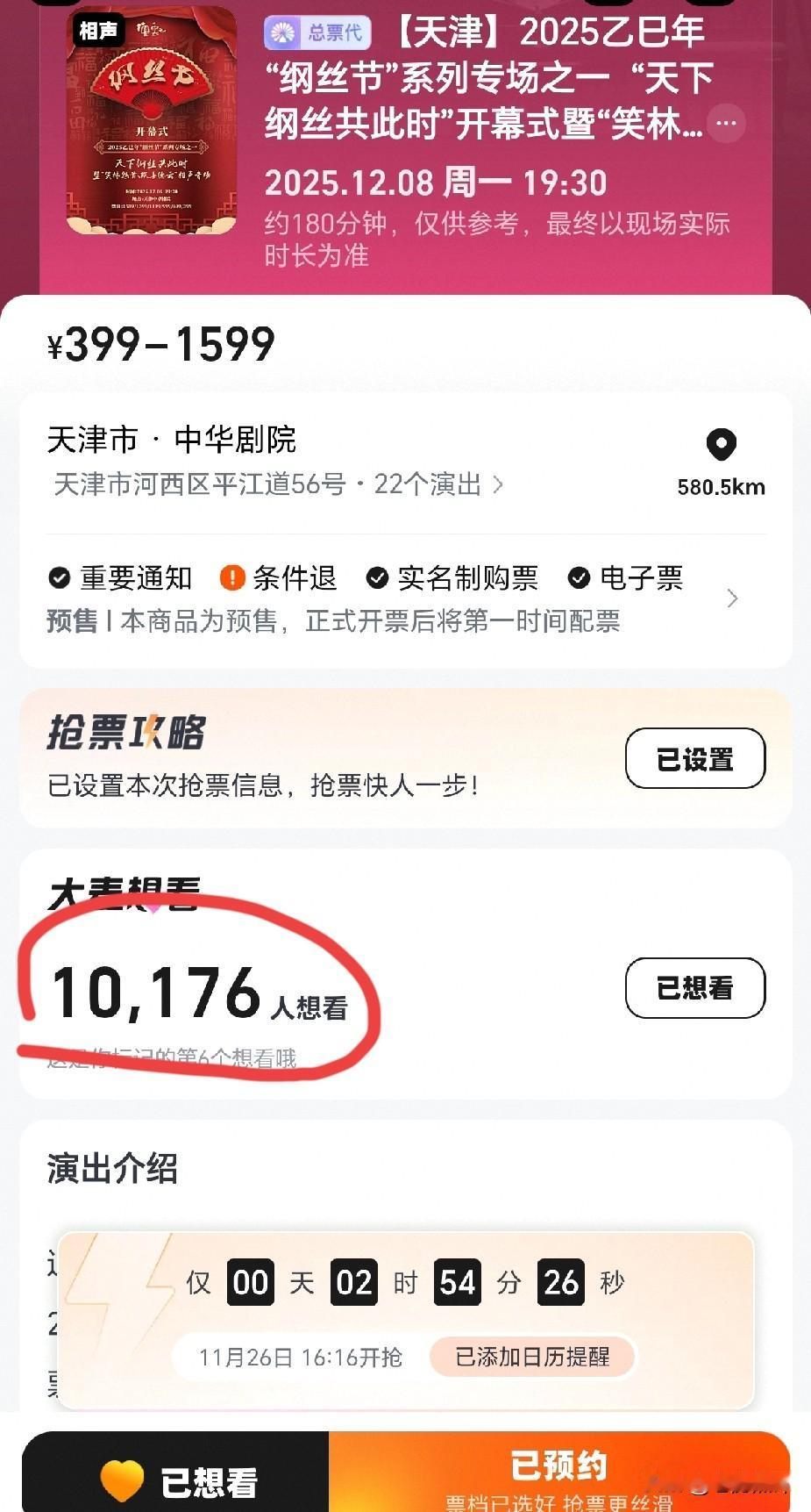 相声市场真的是冰火两重天,有的卖不出去票,小园子倒闭了,有的在体育馆演出都座无虚席。你看岳云鹏跑到巴黎和伦敦说相声都能卖满座,人比人真的气死人。 都说相声市场不好了,2025年纲丝节第一场演出再过2个小时就要开票了,天津中华剧院只有1006个座位,大麦初始售票只有600张。 但现在大麦预约人数已经超过1万人,又是拼手速的时候到了。想想看,1万多人抢600张票,多激烈的竞争! 我去年看了纲丝节鹤字科专场,感觉不错。刚才在大麦已经预约了纲丝节前两场的票,也不知道待会手速和运气怎么样?